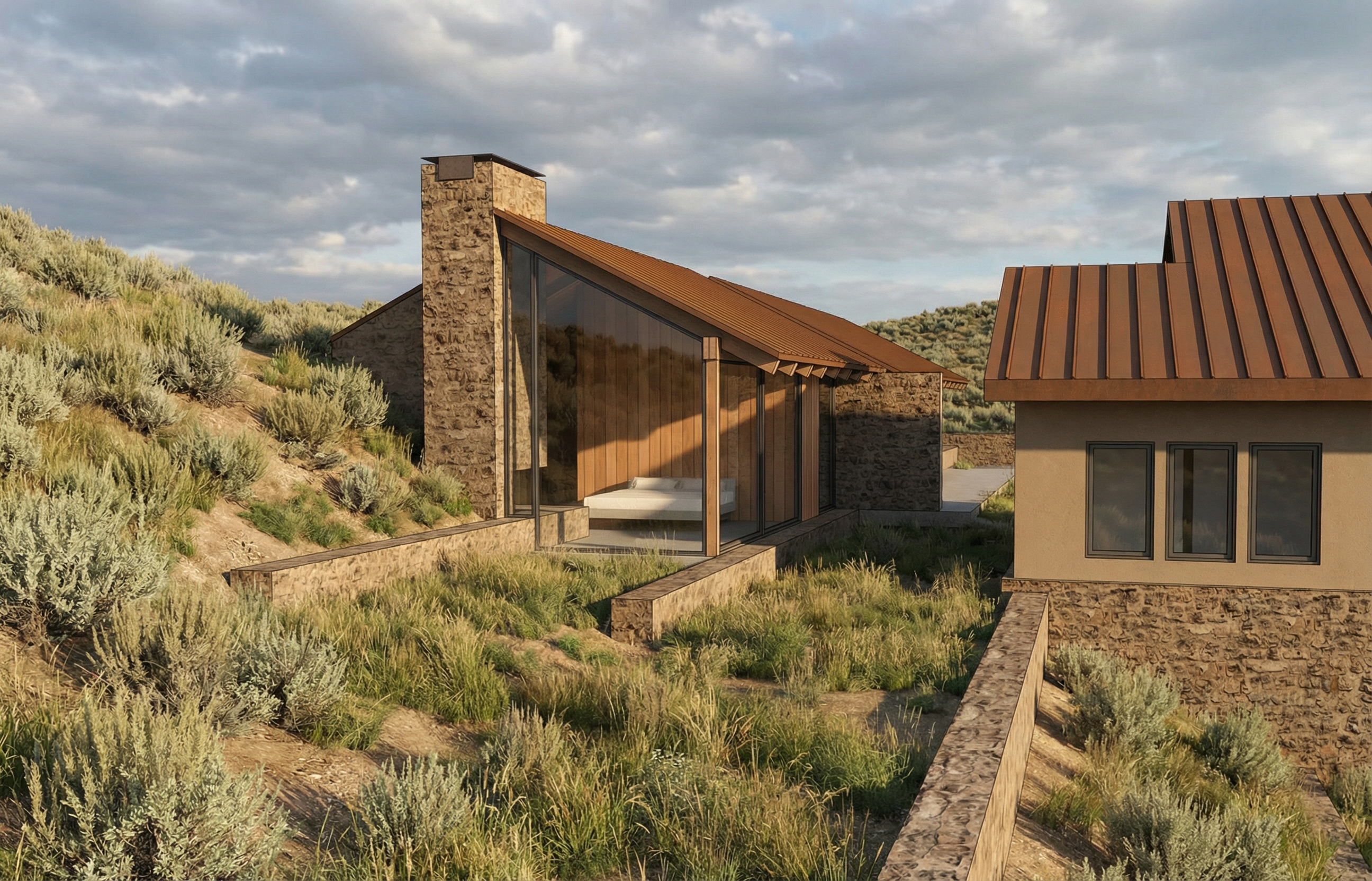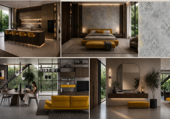 high end architectural moodboard editorial layout not a simple collage clean grid but slightly asymmetric composition large hero images mixed with small detail shots include modern living room with mustard ochre sofa bronze pet kitchen luxury bedroom with textured wallpaper elegant entrance with sculptural mirror outdoor patio at sunset add material samples section dark wood bronze metal stone fabric ochre textured wallpaper add color palette circles ochre bronze warm beige dark wood black accents soft green minimal typography in italian very refined title armonia materica small subtitles living cucina camera outdoor magazine style luxury interior design presentation board soft warm lighting neutral background lots of white space balanced composition very elegant not crowded ultra realistic architectural presentation studio quality