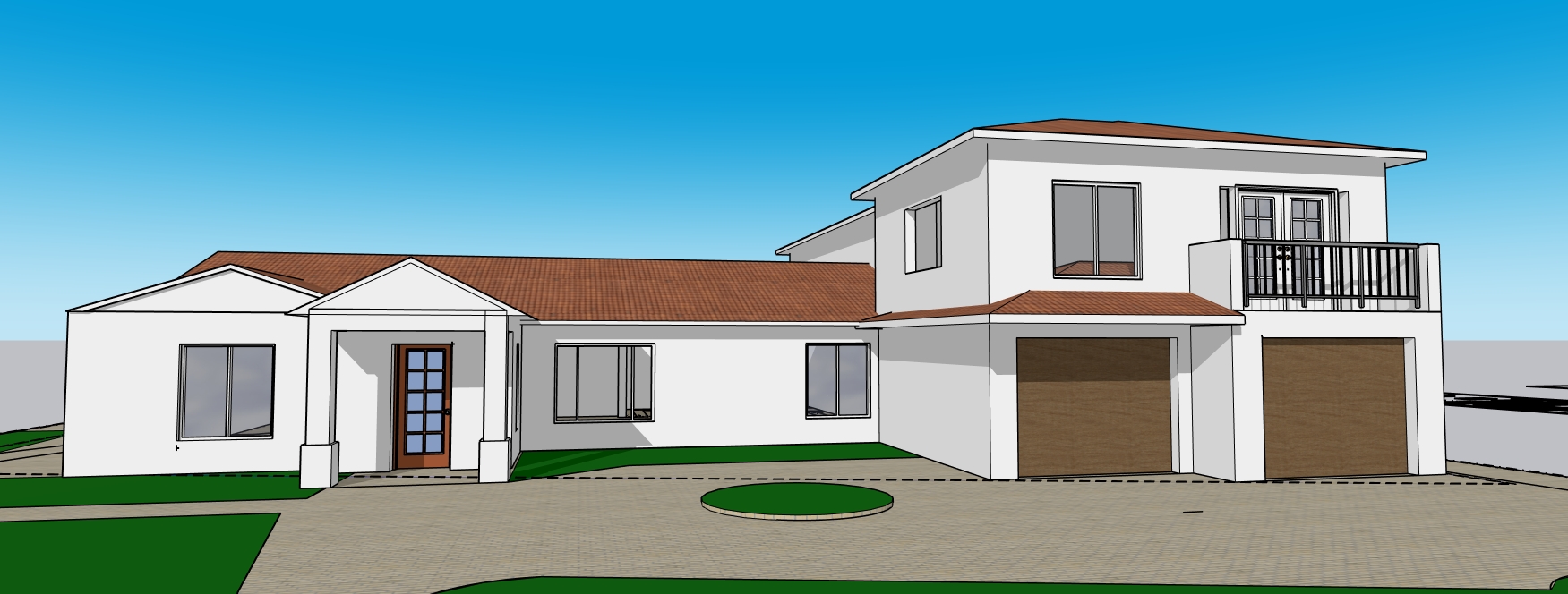 a modern two story house with a minimalist spanish style design the exterior walls are painted in crisp white complementing the sleek white window frames the roof is clad in terracotta tile adding warmth and texture surround the house with lush green grass and a neatly paved driveway made of light gray cobblestones the sky above is a clear azure blue with soft fluffy white clouds adding a serene touch the atmosphere is peaceful and inviting evoking a sense of tranquility and modern elegance tropical luxurious landscape