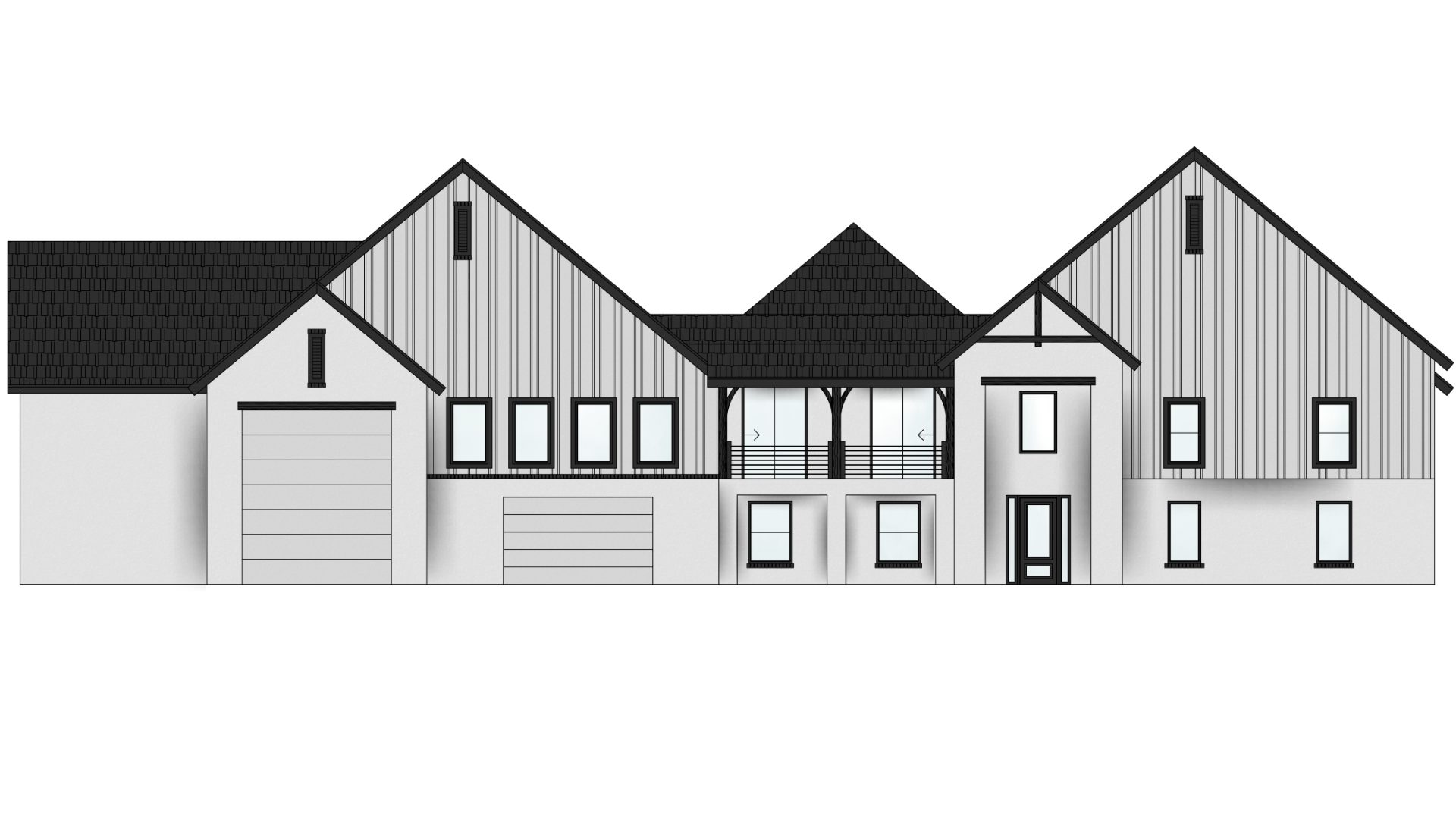 a modern farmhouse with a crisp white exterior and contrasting black roof accentuate the vertical siding with subtle gray shadows windows outlined in sleek black trim reflecting soft blue sky a warm inviting atmosphere with golden light illuminating the interiors suggesting a cozy and welcoming home