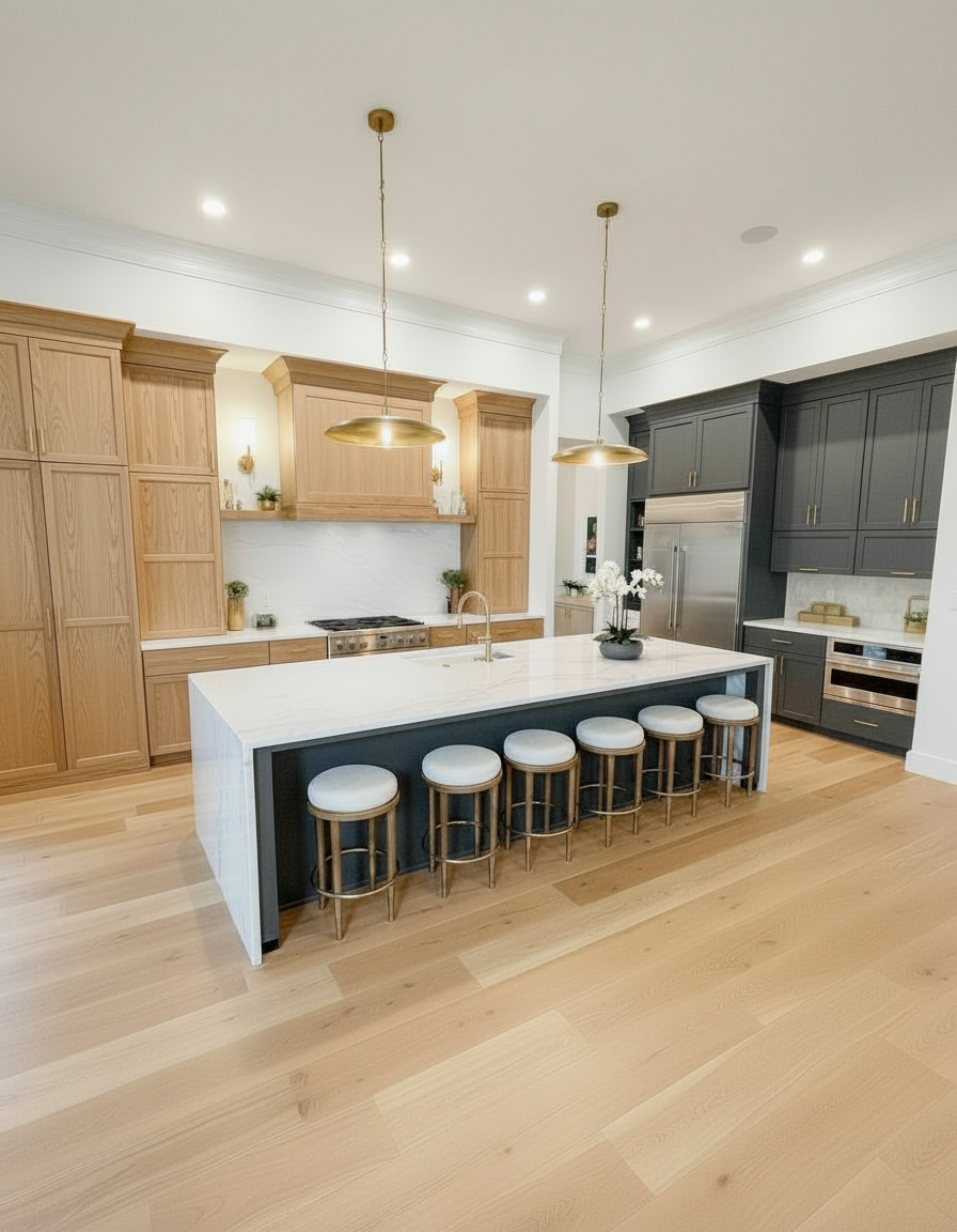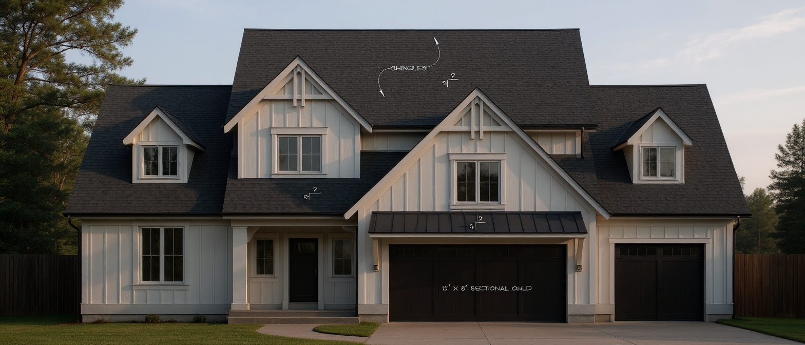 render a modern single story house with a combination of cream colored siding and brown brick accents the gable roof is a neutral beige tone large white framed windows are set symmetrically the scene is placed in a serene suburban setting with a lush well manicured green lawn surrounding the house front a light gray driveway leads to the entrance the atmosphere is peaceful and bright under a clear blue sky with fluffy white clouds capturing a warm sunny day ambiance