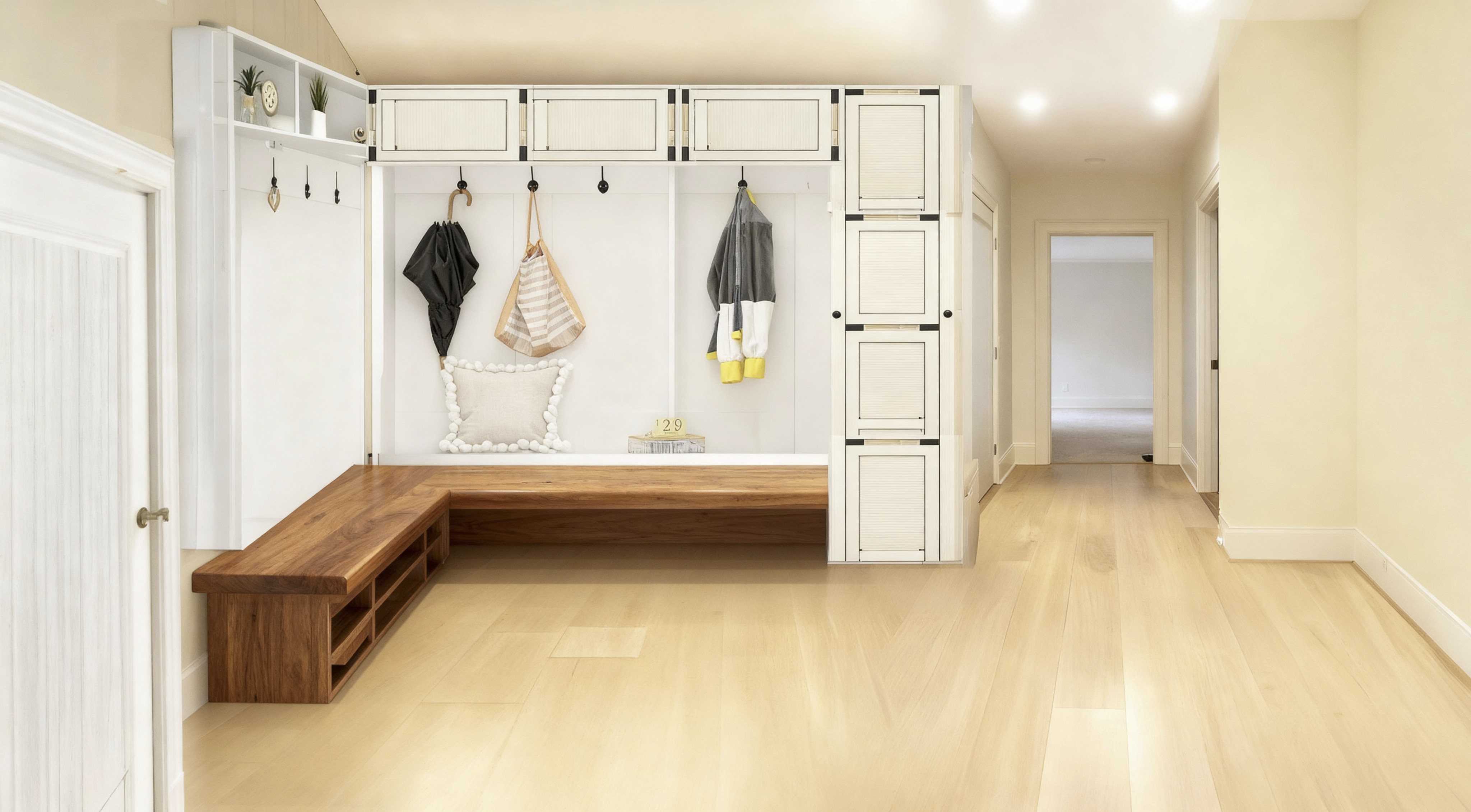 add small drop table top at end of bench make room a little smaller on the hallway side