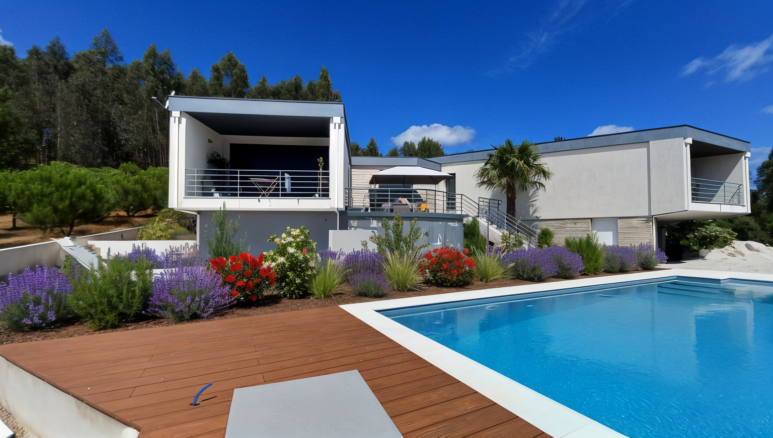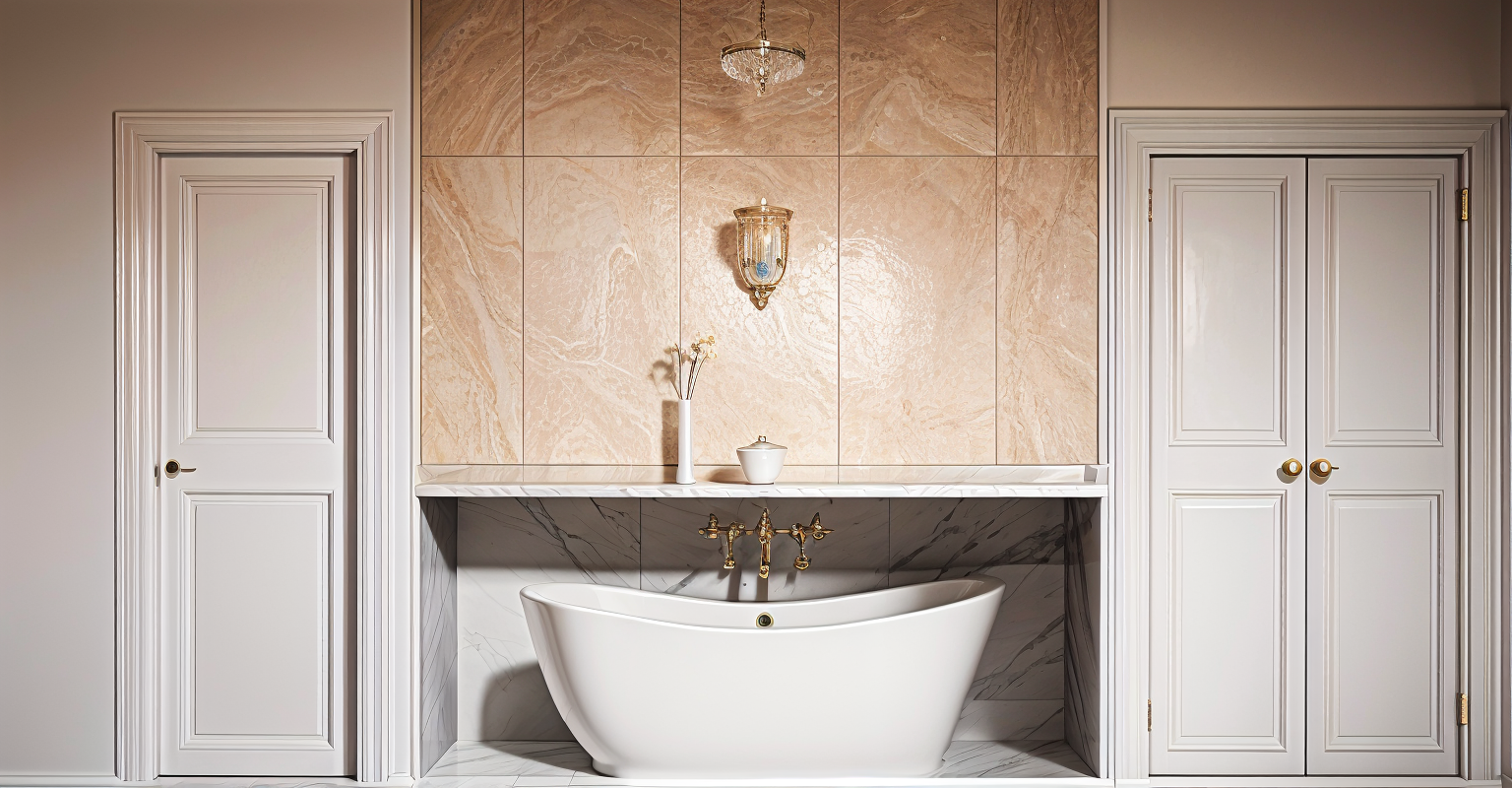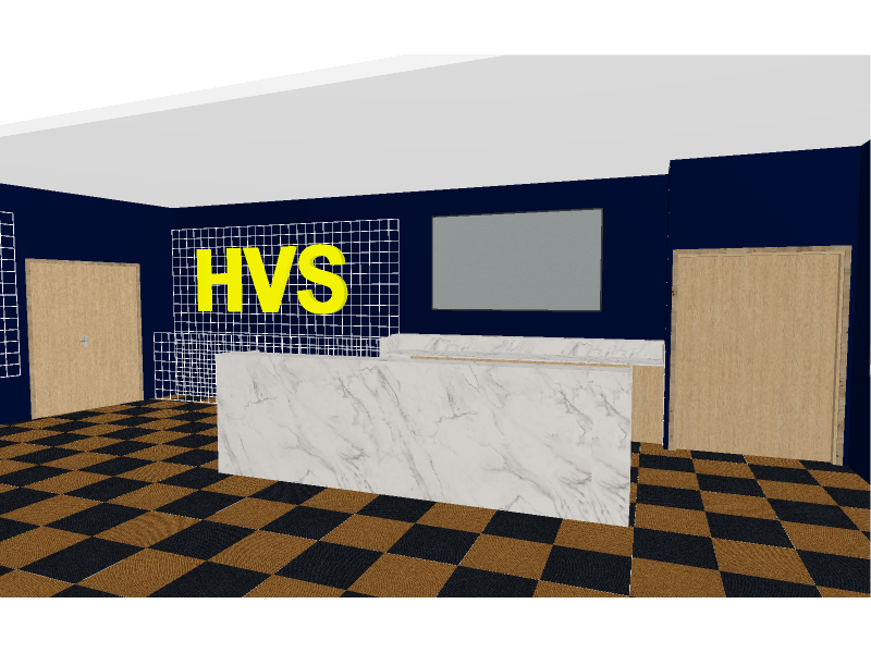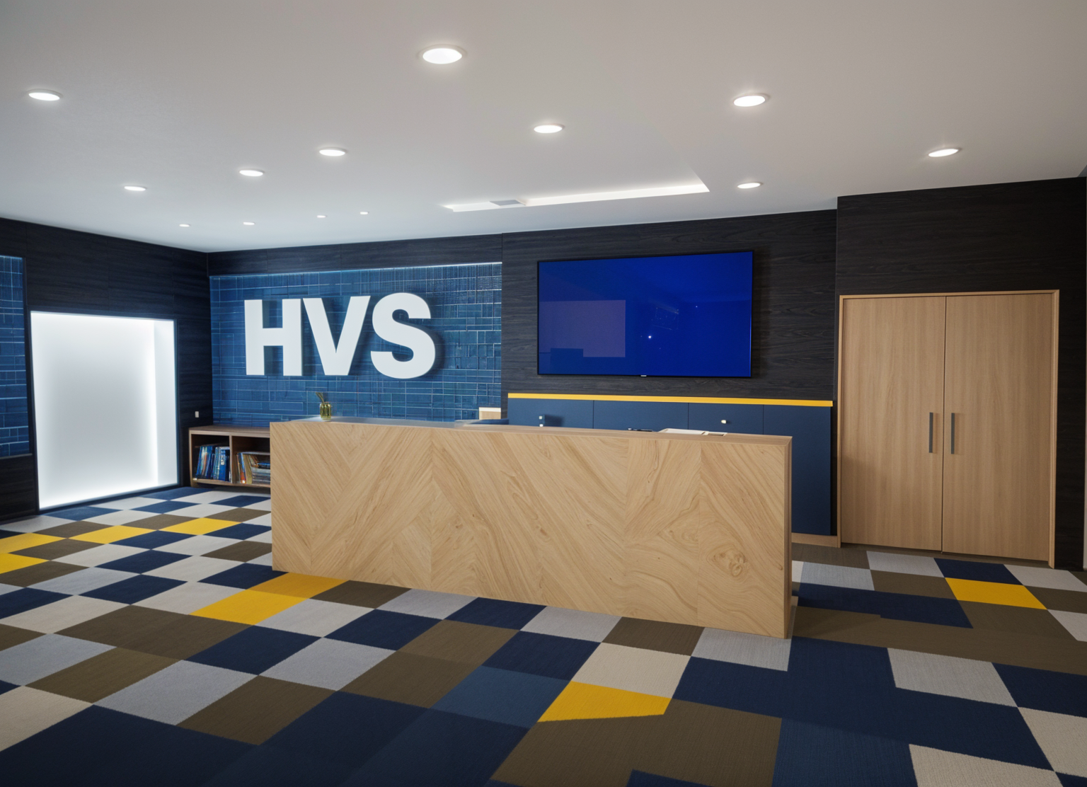 sport center lounge with a reception desk floor textile tile with dark yellow and blue grid light oak and light stone on desk info screen on the wall architecture