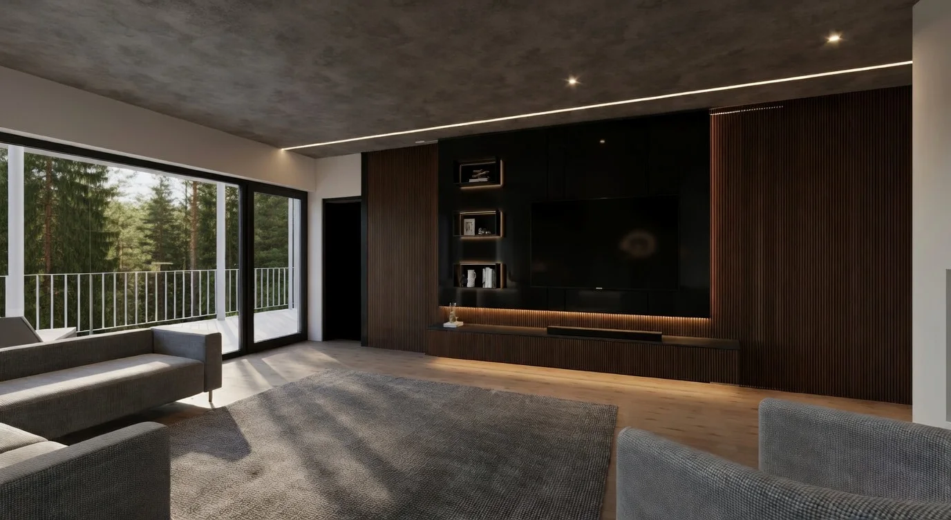 match lighting and mood of a bright modern bedroom with natural daylight soft diffused daylight balanced exposure no harsh contrast no dramatic shadows bright but soft interior lighting realistic daylight entering through windows neutral and warm tones clean architectural photography style consistent material palette warm smoked oak wood soft concrete textures natural colors no dark or moody atmosphere high end interior photography minimalistic and calm evenly lit space no strong artificial lighting no overexposed highlights match lighting across all images same brightness and tone as reference bedroom image soft shadows realistic exposure architectural photography natural daylight realism