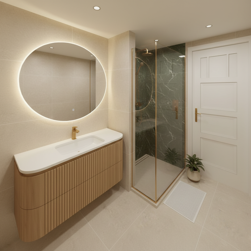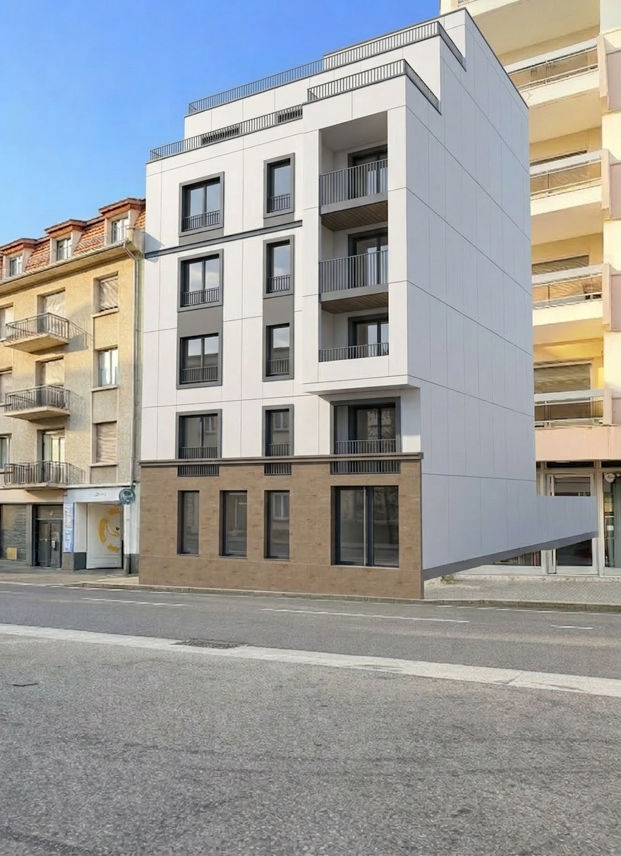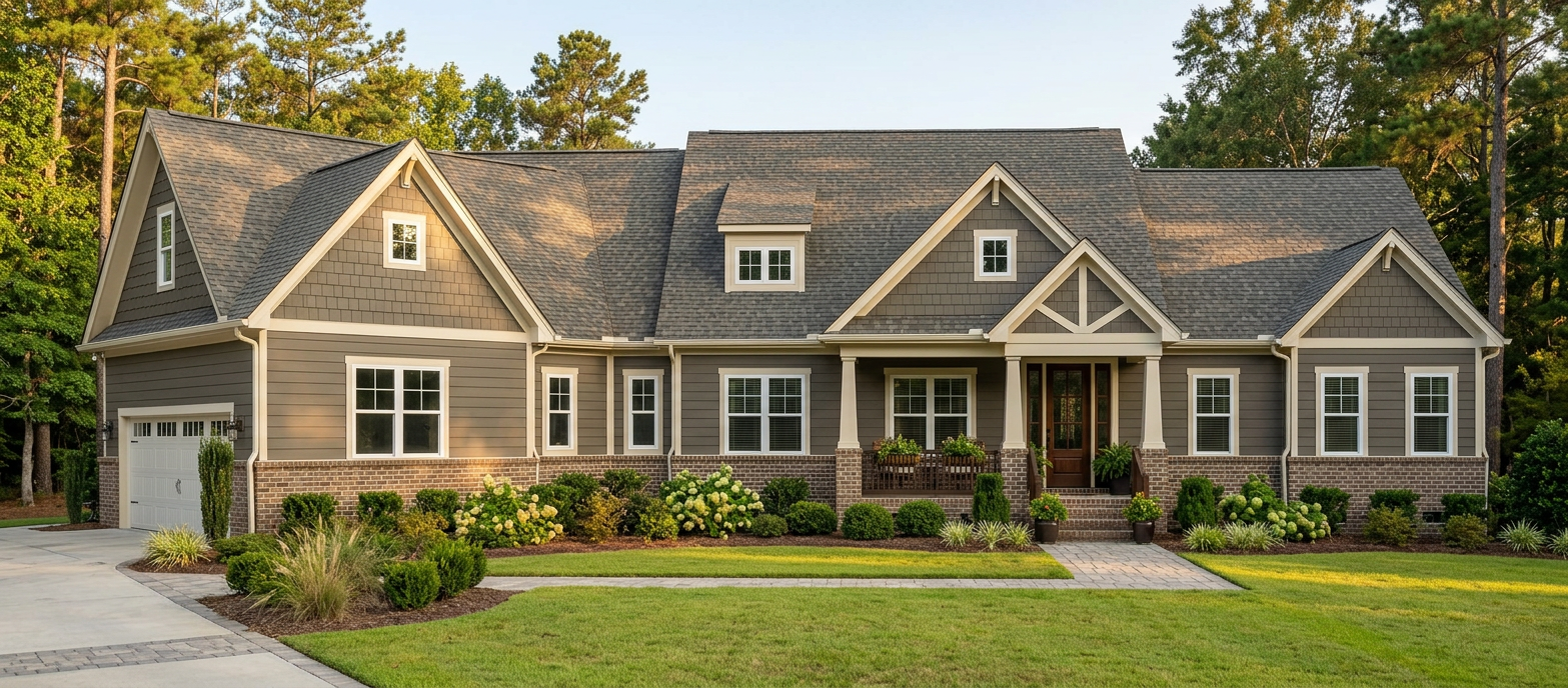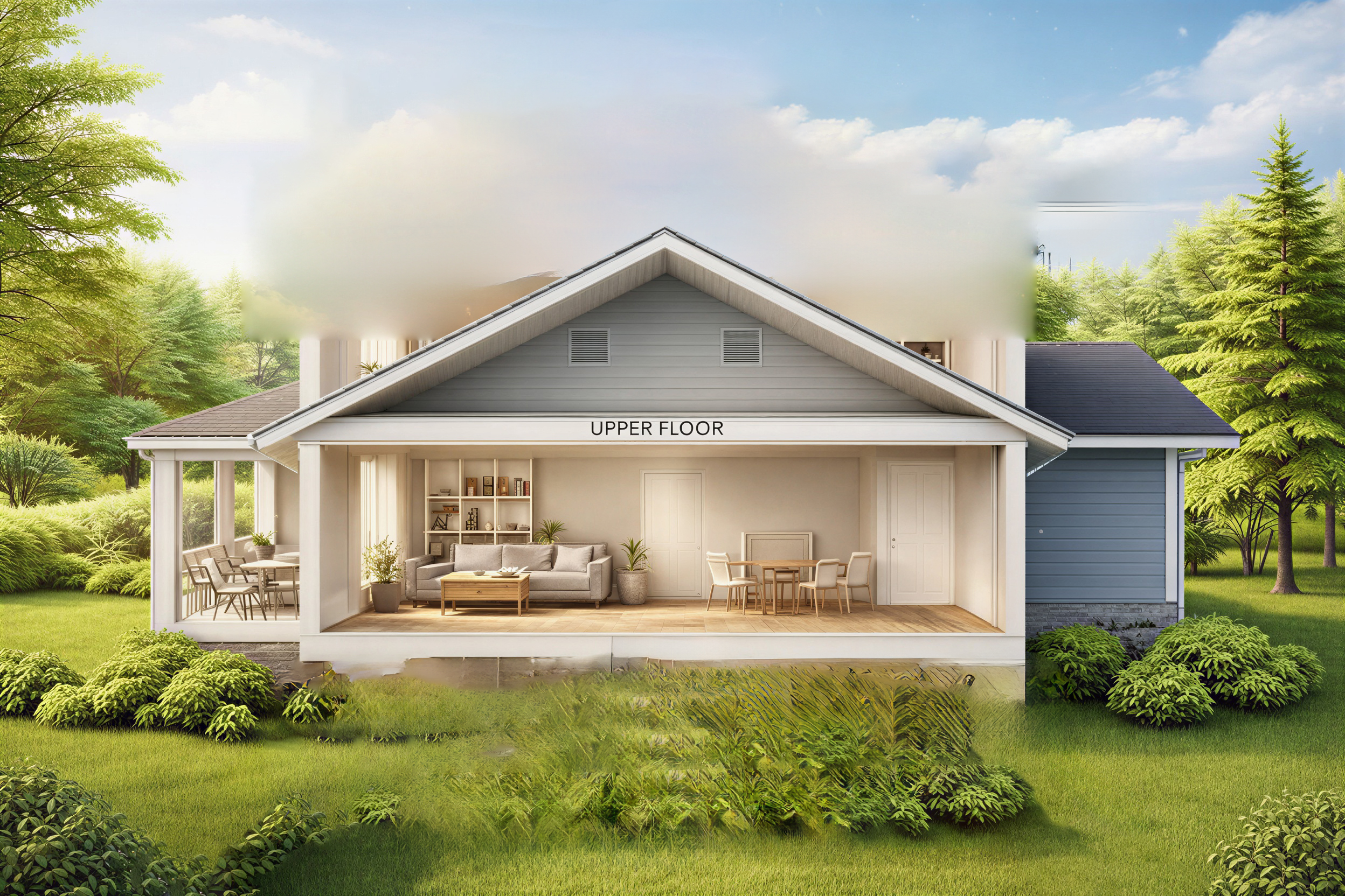 architectural cross section cutaway illustration of a single story residential home in winter setting the house is shown from the front with the facade cut away to reveal the interior the house has a low wide profile with a single pitched roof exterior snow covered landscape evergreen and bare trees heavily laden with snow overcast winter sky gray blue siding on the house exterior snow accumulated on the rooftop and eaves with small icicles hanging from the gutters attached garage visible on the right side with snow on its roof a snow covered front yard stretches out toward the viewer with snow dusted shrubs and bushes lining the base of the house all snow and winter weather is strictly outside the house only main floor ground level open concept living and dining area living room with a gray sofa coffee table and plants dining area with chairs and table wood flooring throughout warm cozy interior lighting covered patio porch visible on the left side with snow dusted outdoor furniture bookshelf and storage cabinetry along the walls the single floor sits directly at grade level with snow meeting the base of the house seamlessly photorealistic rendering style clean modern interior design warm glowing interior lighting contrasting beautifully with the cold blue white winter exterior single story only no upper floor no basement no void beneath the house no snow inside the house no falling snow inside rooms no frost on interior walls no text labels no arrows no annotations