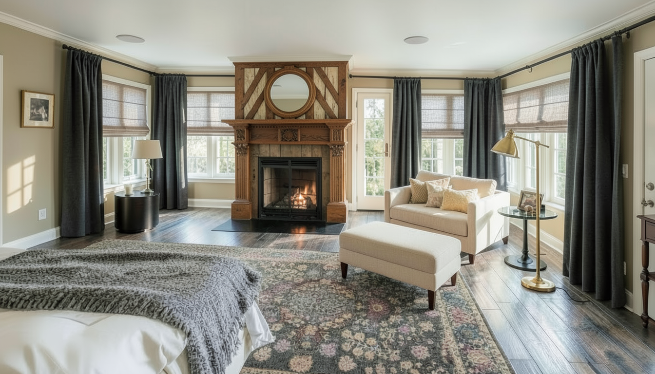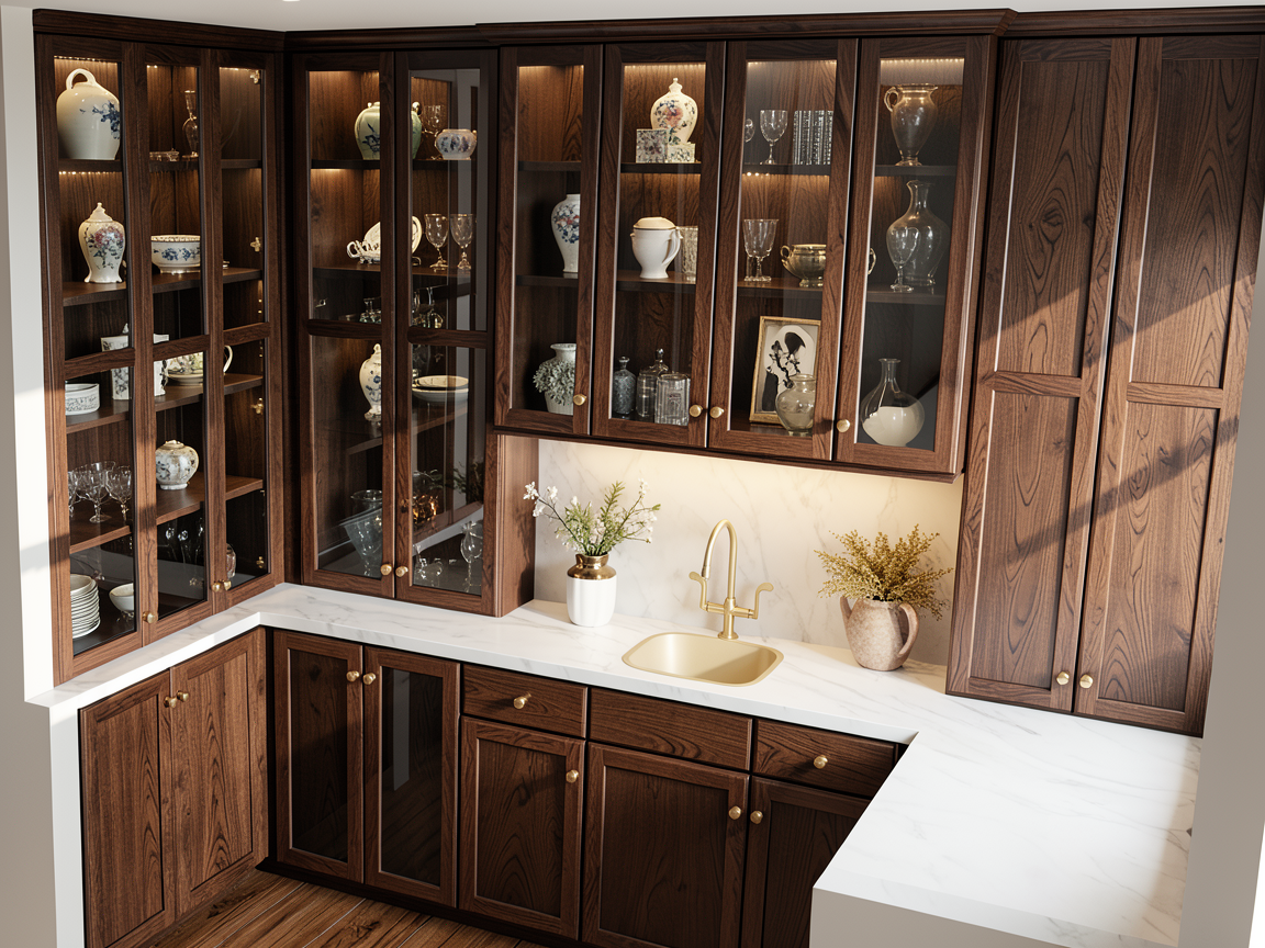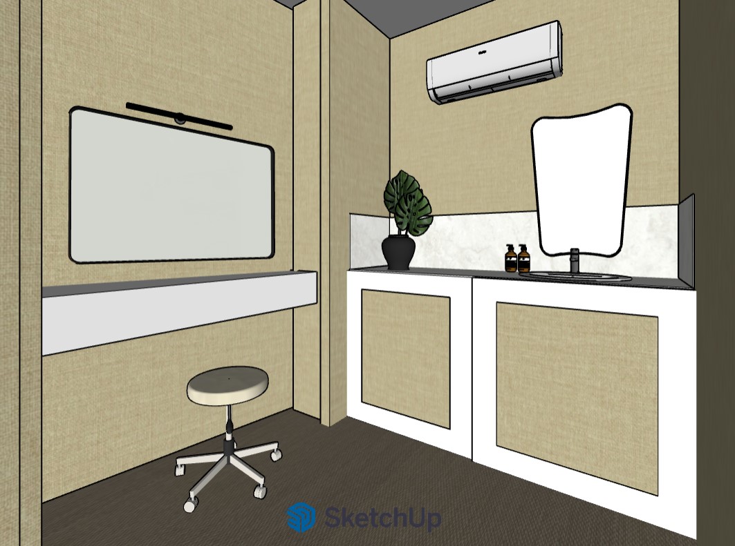 fai il render come se ci fosse la luce artificiale dall alto con faretti led luce calda a 2700 kelvin non mostrare il tetto poi la mensola di colore bianco sporco cosi come i bordi del mobile il pavimento di pvc intrecciato finedel colore che vedi e le gambe dello sgabello nella parte nera sono beige satinate come le ruote che sono pure beige il rubinetto nero satinato