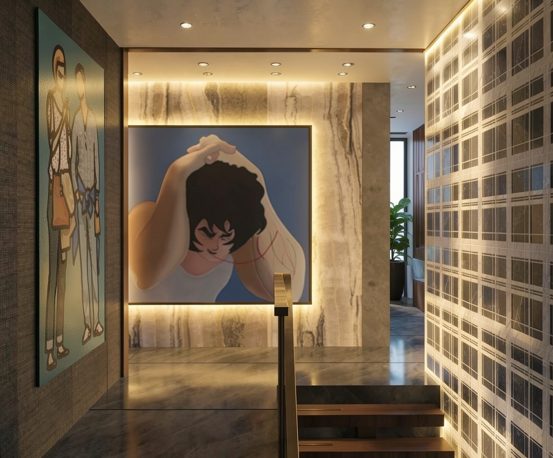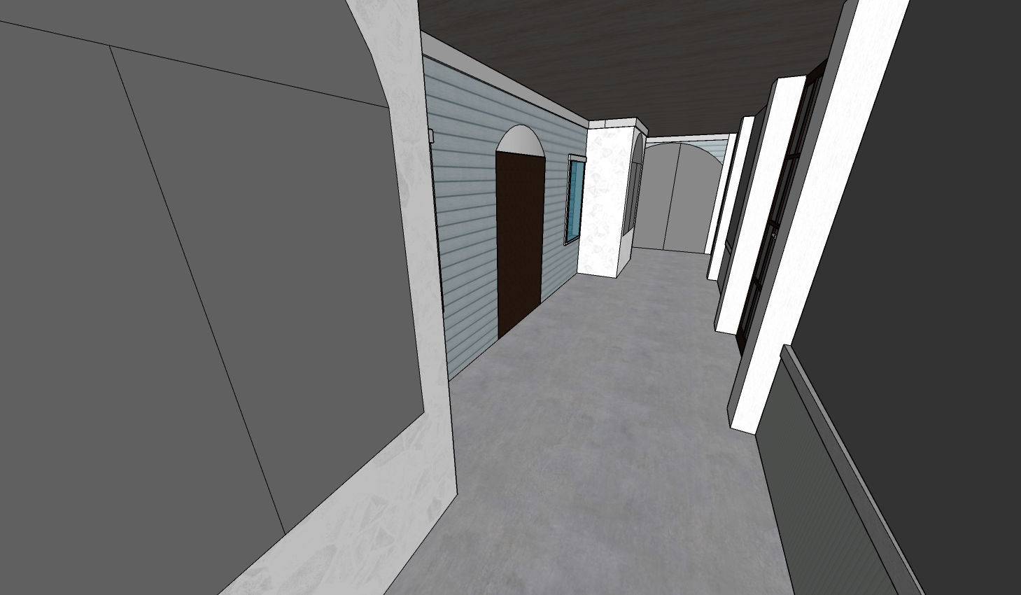 make the blue and yellow window on the left look realistic it should be a glass window with an arched top in the color white it should also have white trim