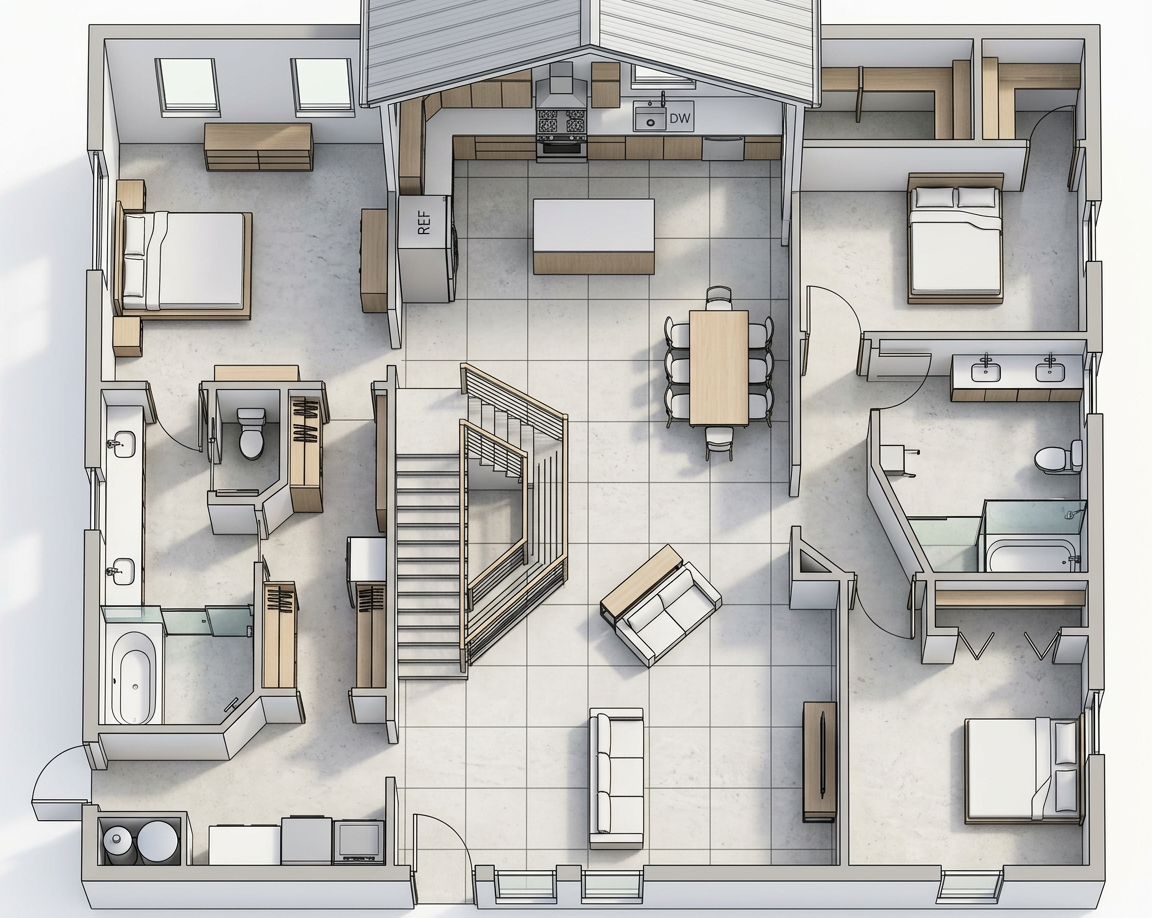 convert this floor plan into a architectural isometric 3d view of a full house show the space from an elevated angle with furniture walls and details visible monitor style barndominium open ceilings throuout living room and dining room with clearstory windows use the same furniture as shows on the plan do not change the orientation of the floorplan