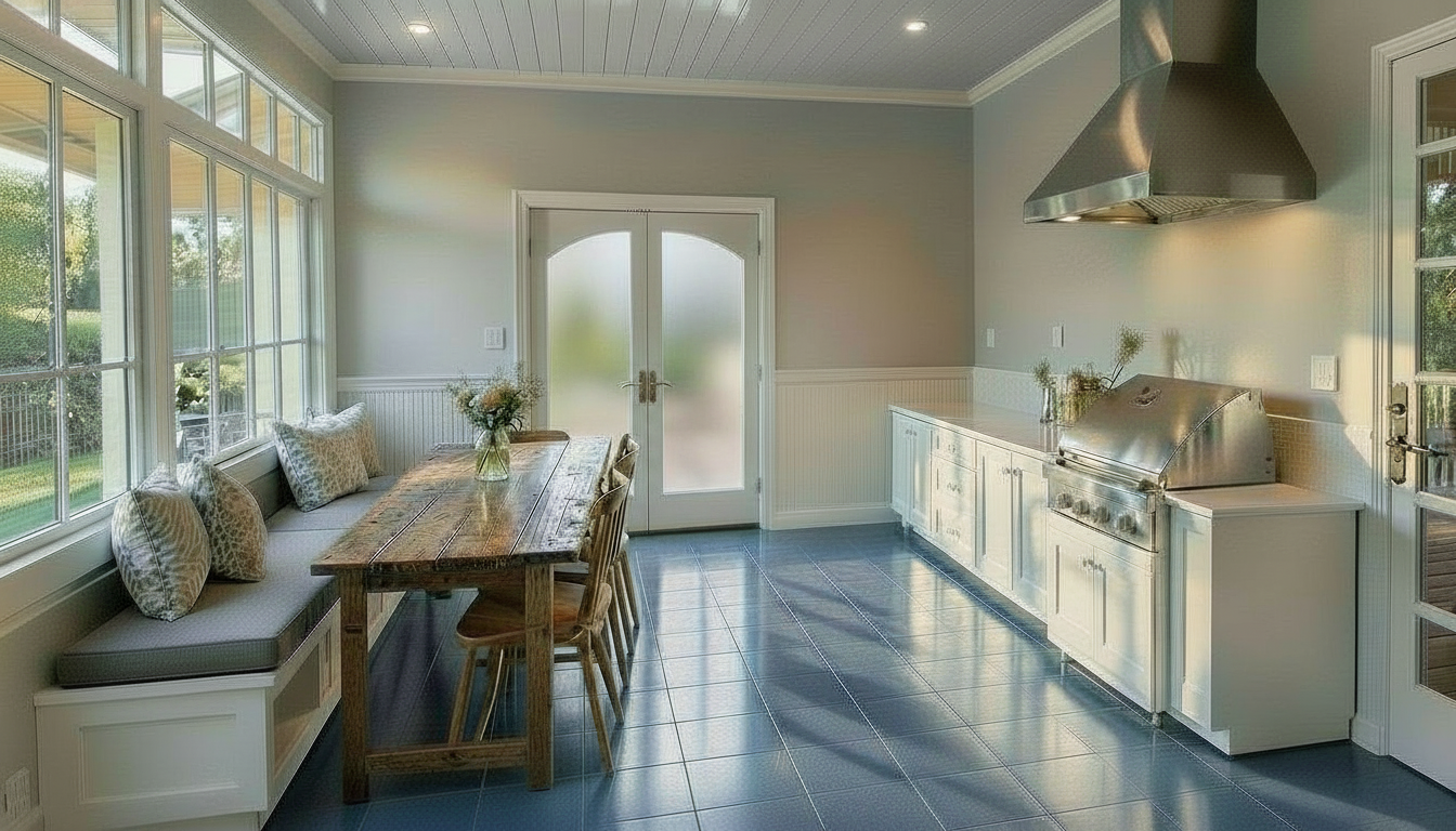 create a warm and cozy 4k image of this outdoor kitchen the blue floor and ceiling should still show as pale washed out blue even with the soft lighting the glass door should be frosted