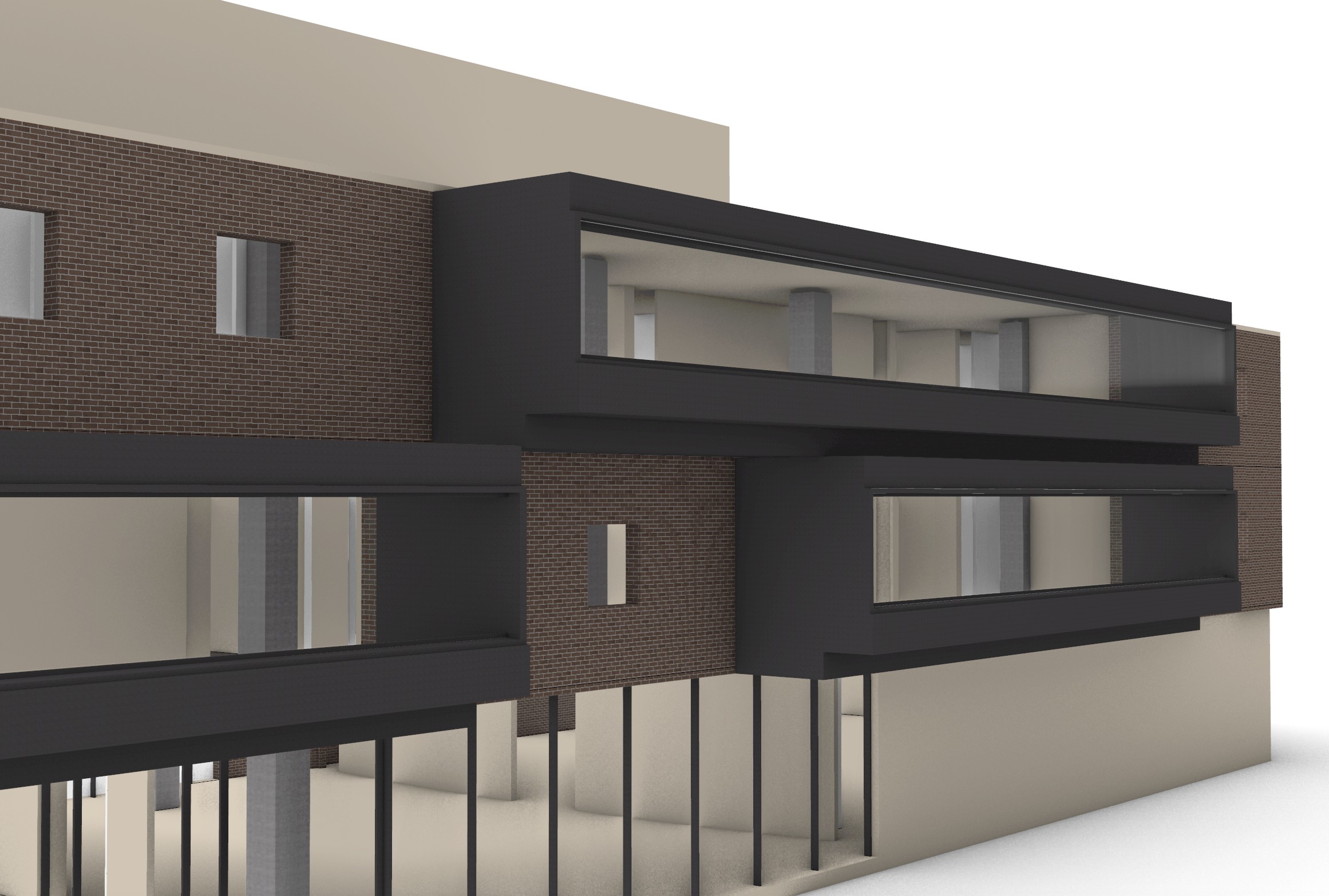 modernist exterior shot brick school building iron window bump outs blue tinted glass architecture