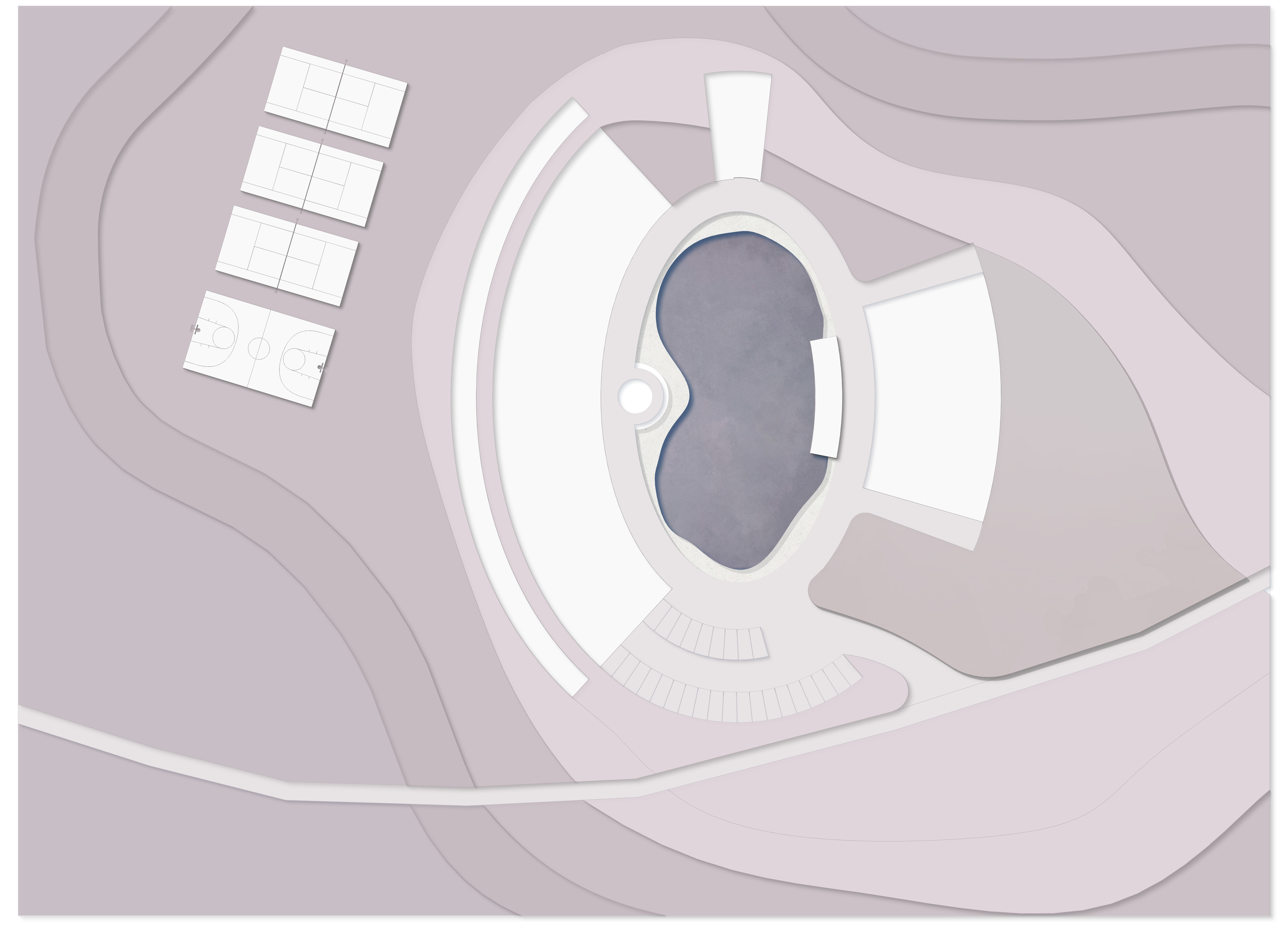 aerial shot top view masterplan of an outdoor wellness and sports complex with an organic shape central pool and curved terraces minimal architectural drawing style soft monochrome pink and lavender site plan thin dark lines outlining all buildings paths stairs and sports courts trees as simple circular symbols with light hatch clear contour lines in the landscape flat 2d diagram no photorealism no realistic materials no strong shadows make it look like a drawing architecture