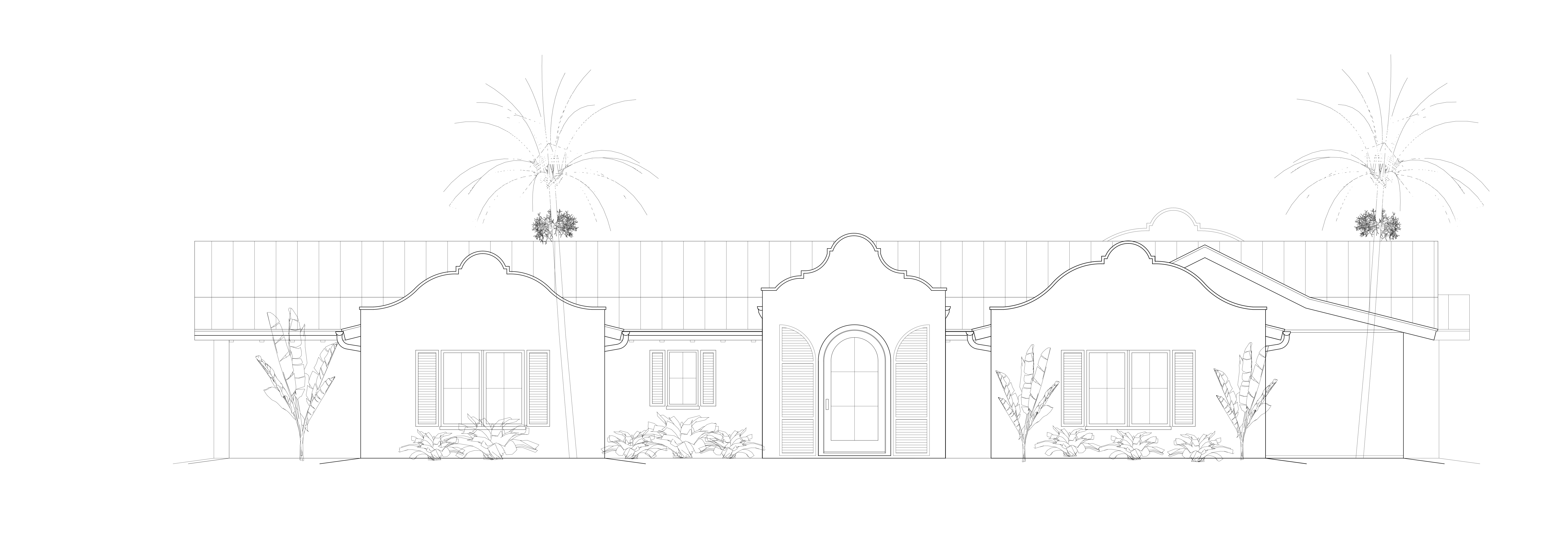 architectural watercolor rendering of this south florida cape dutch style home white stucco walls silver or light brown roof metal roof baby blue shutters mahogany front door add a large oak tree on front right