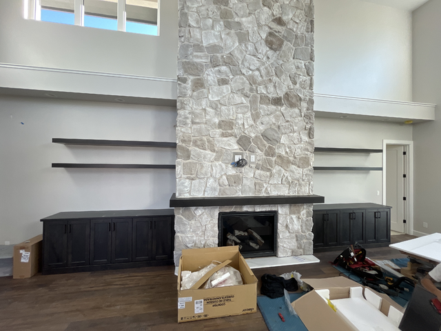remove everything and restage this living room put a tv with screen saver above the mantle stage the floating shelves and the wood top stage the drywall shelf at the top with a couple simple plants