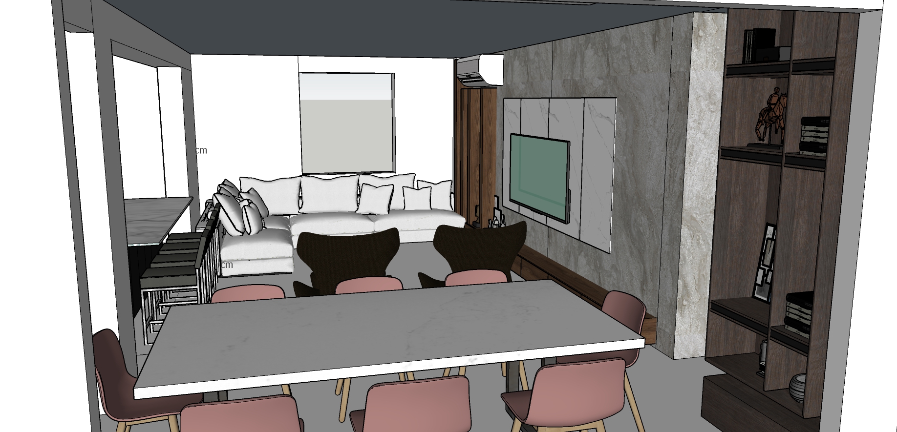 modernist interior shot santras t renk masa gr kumas sandalyeler koltuk beyaz tonu ve rahat oturum zem nde ac k renk hal tv arkas duvar beton s va kapl architecture