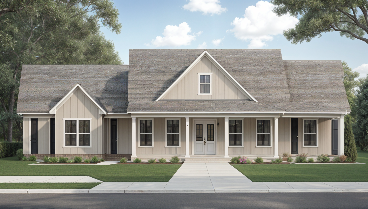 convert this elevation into a realistic 3d exterior rendering choose a cohesive timeless color palette appropriate for the architectural style use complementary siding and roof tones with natural contrast add professional landscaping and realistic driveway balanced daylight lighting builder grade but clean and polished presentation maintain architectural accuracy preserve proportions do not alter structural layout