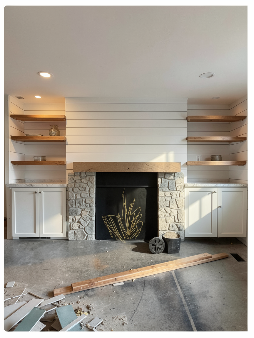 put a fire in the fireplace and make the rock white thin stacked stone