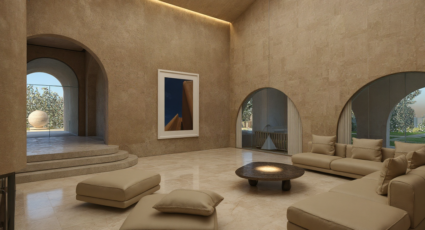 residential design minimalistic contemporary approach large marble table and wooden baffle ceiling with indirect lighting beige andreu world chairs wooden wall integrated large sliding door for the kitchen burgundy kitchen stools beige large format ceramic tiles central furniture in wood and marble with indirect lighting facing to the large table