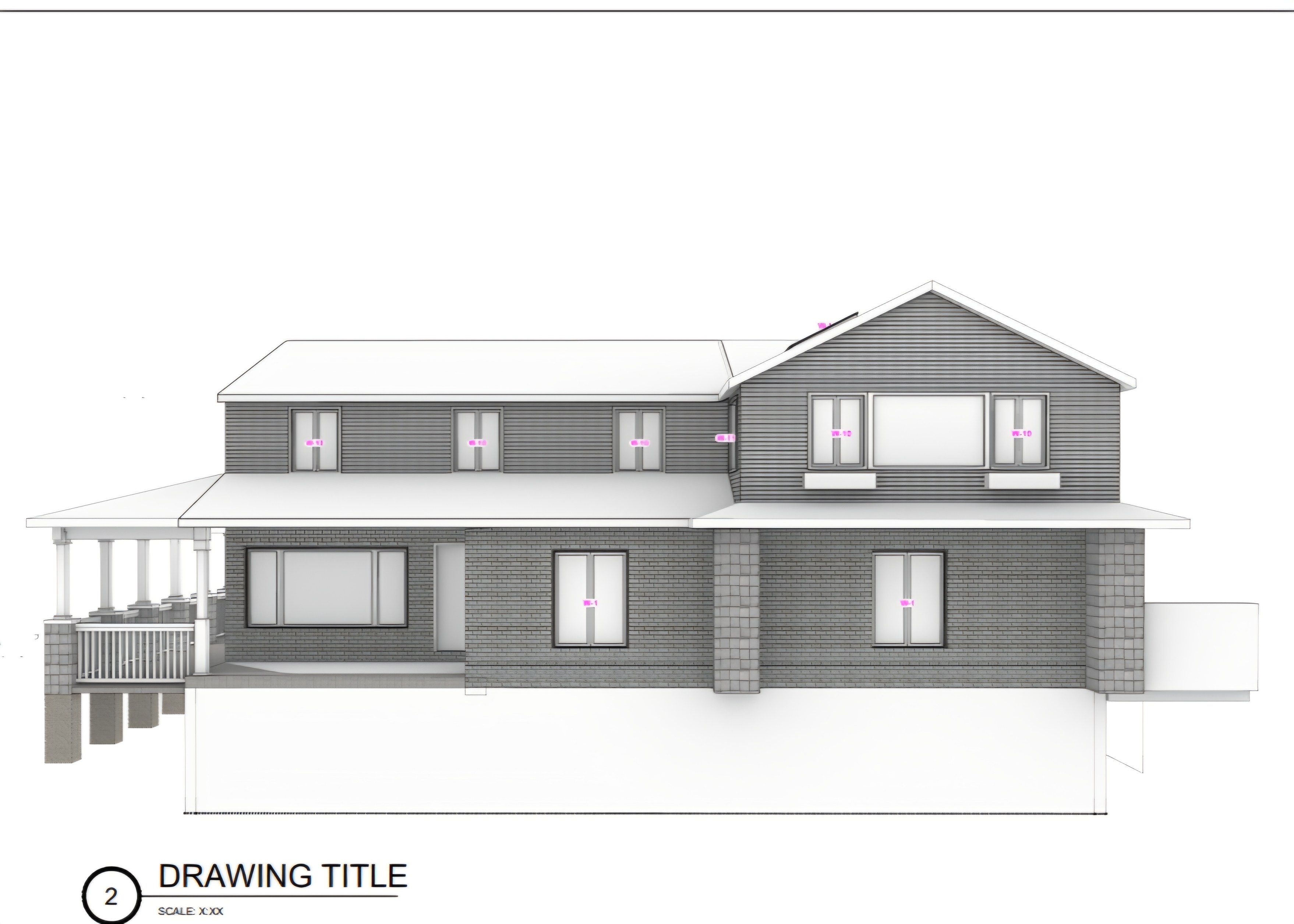exterior shot render a modern two story house with a spacious porch victorian railings corbles under soffit the facade features horizontal siding and textured stained brick for the base use a soft white for the window frames and roof for contrast incorporate large glass windows for natural light the atmosphere is calm and inviting with a clear blue sky above use natural shadows to enhance the depth and dimension highlighting the architectural details