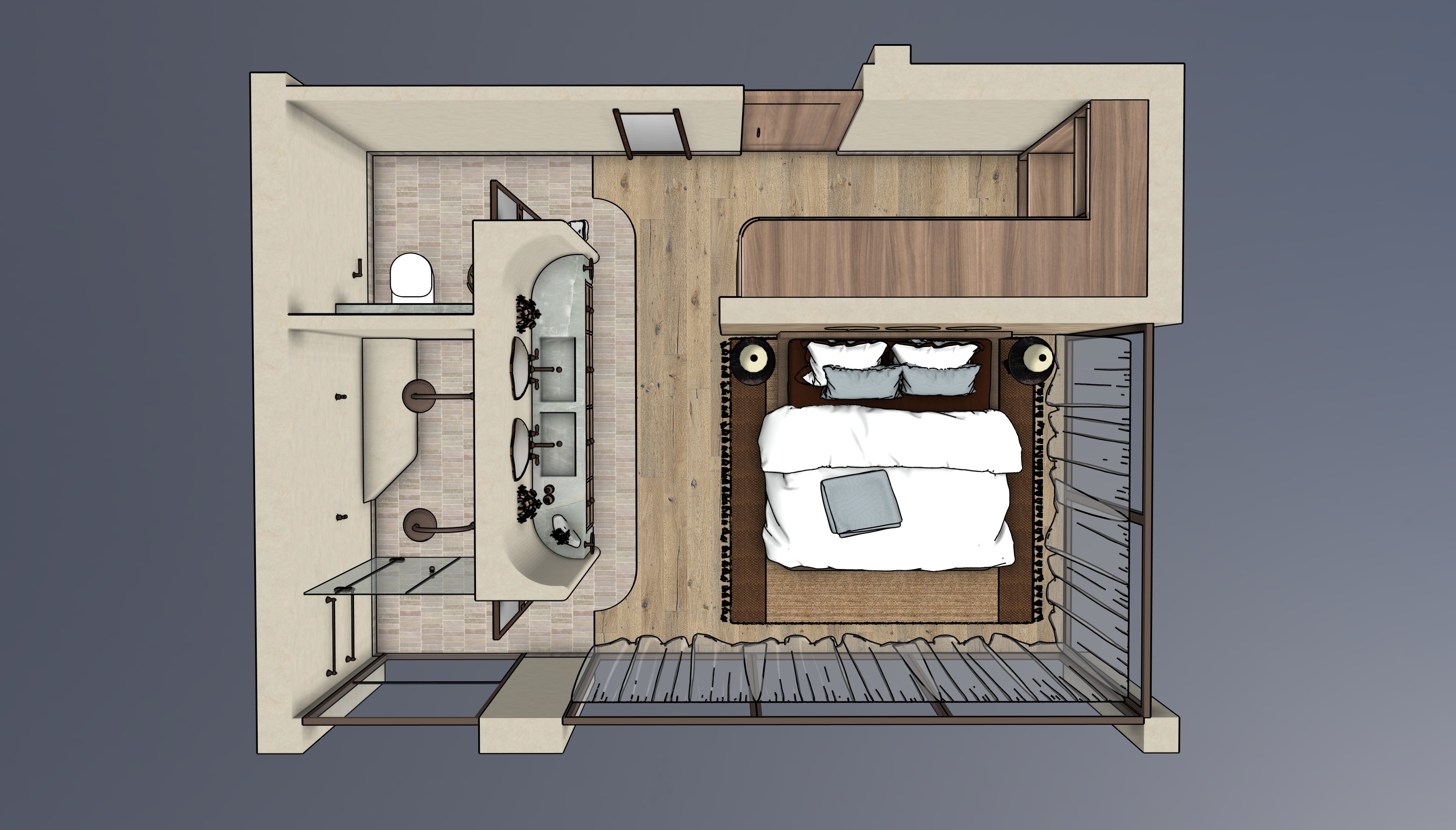 walls and ceiling are warm off white limewash vanity stone is soft muted light emerald quartzite vanity cabinetry is a soft muted mid tone timber not dark not light wall behind bed is a freeform stone cladding glass door is bronze frame with flemished textured glass insert golden hour moody turn bedside lamps and wall sconces on bedside lamps are rice paper wall sconces are an amber toned murano glass