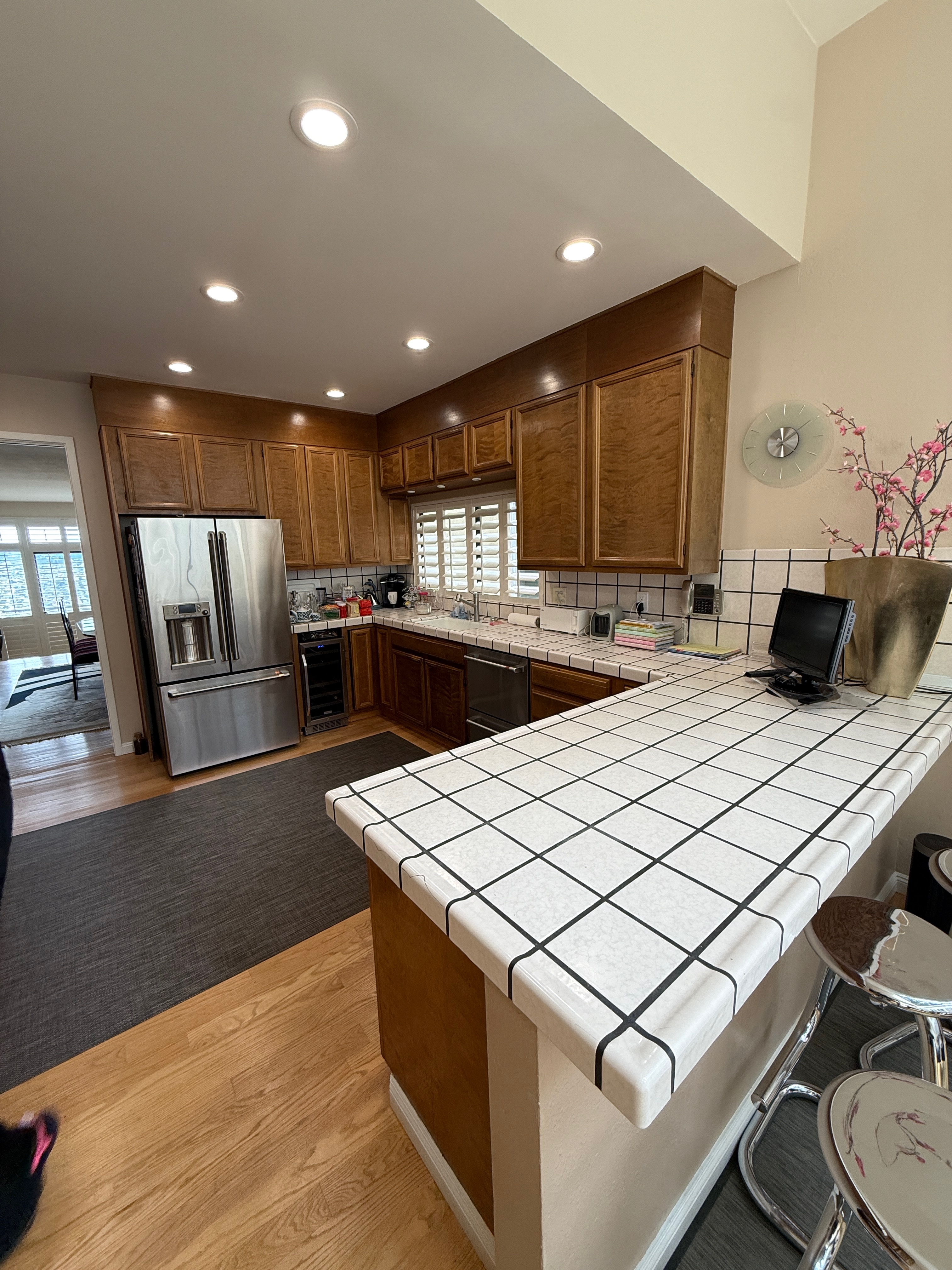 refinish this kitchen in a modern way use san francisco luxury design elements with neutrals and greens make the cabinetry all the same color in a more beige warm tone than grey the green should be more of a sage the countertops should be marble with veining make the light fixtures more artful and interesting make the cabinet deep enough on the refrigerator so that i don t see the side of the refrigerator