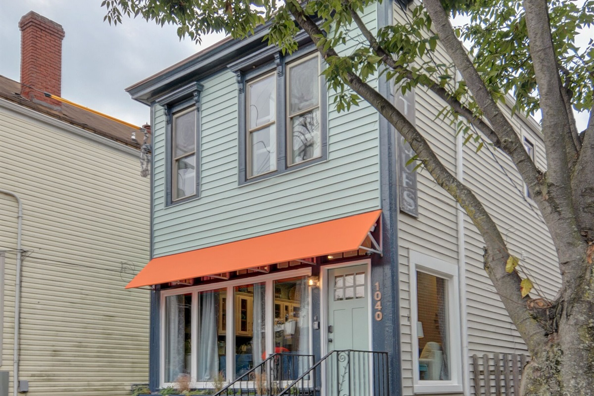 paint the siding of this house hex 45594d and paint the trim hex 303b39 turn the orange awning black paint the front door black