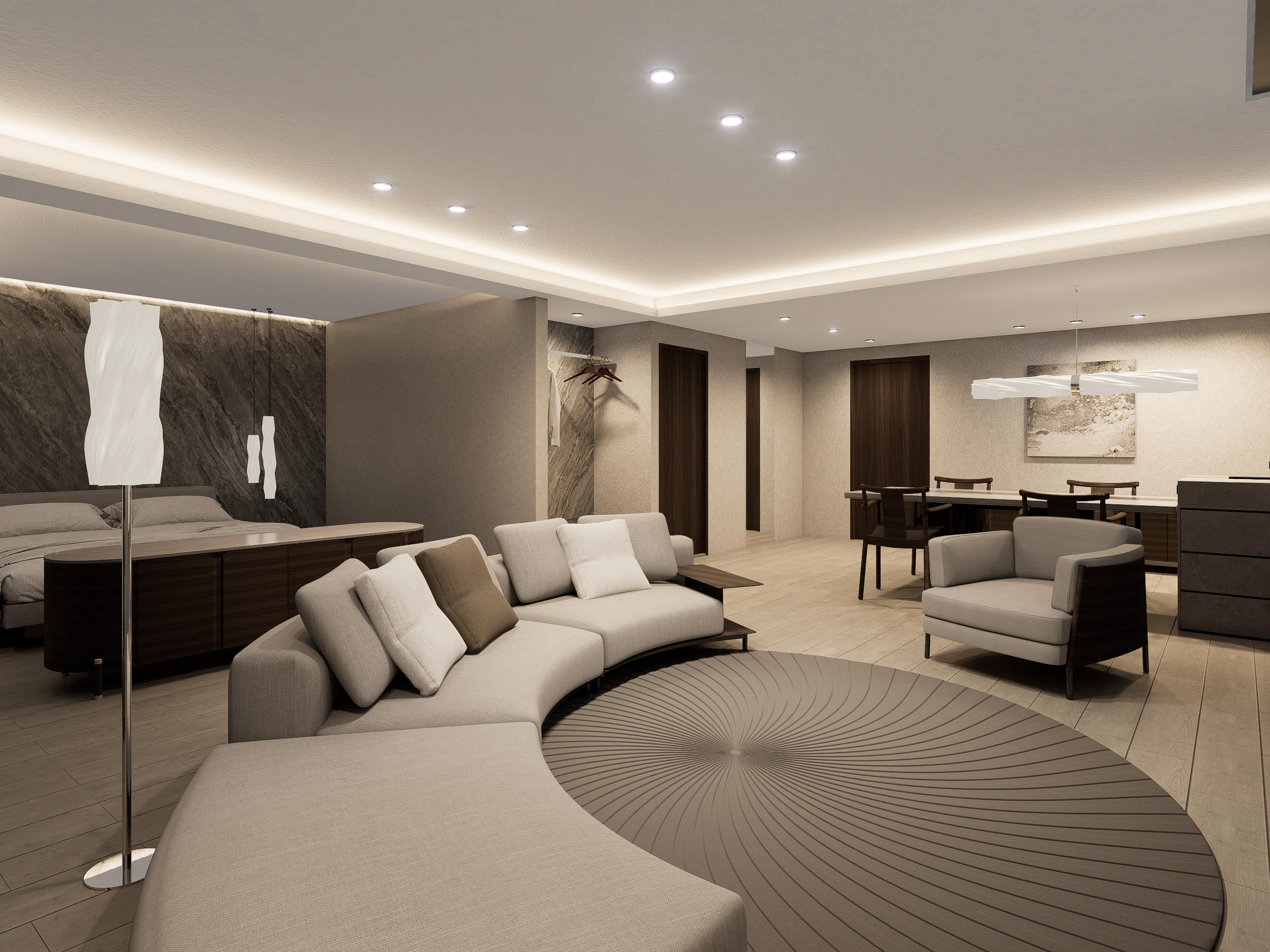 interior shot prompt render a luxurious modern living space with a calm sophisticated atmosphere use a neutral color palette with beige walls and light wooden floors incorporate a curved sectional sofa in light gray with brown and ivory cushions placed around a circular textured taupe rug add a modern floor lamp with a white sculptural shade beside the sofa integrate dark wooden elements for the dining table and chairs providing contrast create soft ambient lighting on the ceiling to enhance the cozy ambiance include marble textures on the wall separating the living and sleeping area maintaining a seamless transition ensure the overall mood is warm inviting and elegantly minimalist style realistic lighting soft ambient color palette neutral beige light gray brown taupe ivory architecture