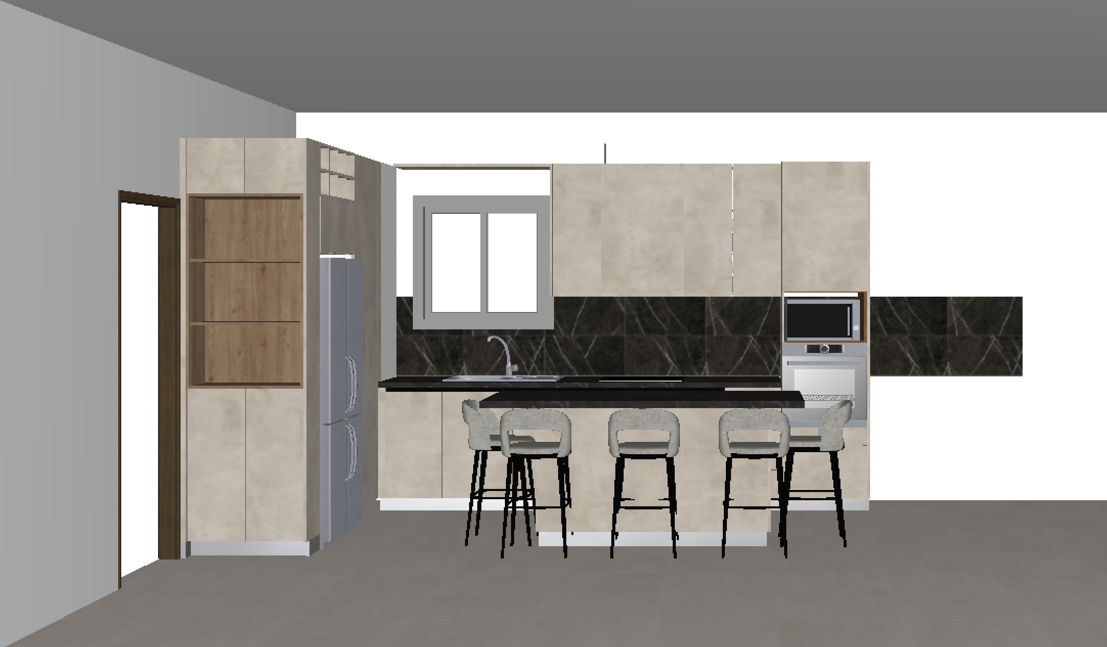 a modern kitchen with a minimalist design featuring light gray cabinets and a sleek black marble backsplash with subtle white veins the countertops are a polished black granite providing a luxurious touch the shelving units and accents are a warm natural wood complementing the cool tones with a touch of warmth a brushed stainless steel refrigerator and built in oven add a sleek contemporary feel the tall bar stools have a muted gray upholstery with elegant black metal legs soft natural light enters through a large window creating a calming and inviting atmosphere the flooring is a smooth polished concrete in a light gray hue enhancing the modern aesthetic the overall ambiance is sophisticated and serene perfect for a stylish urban home