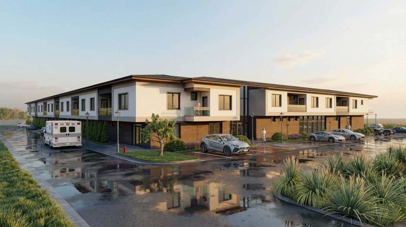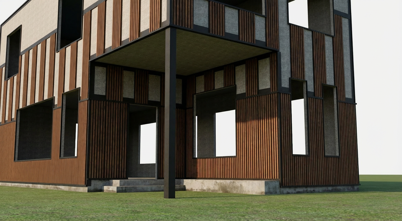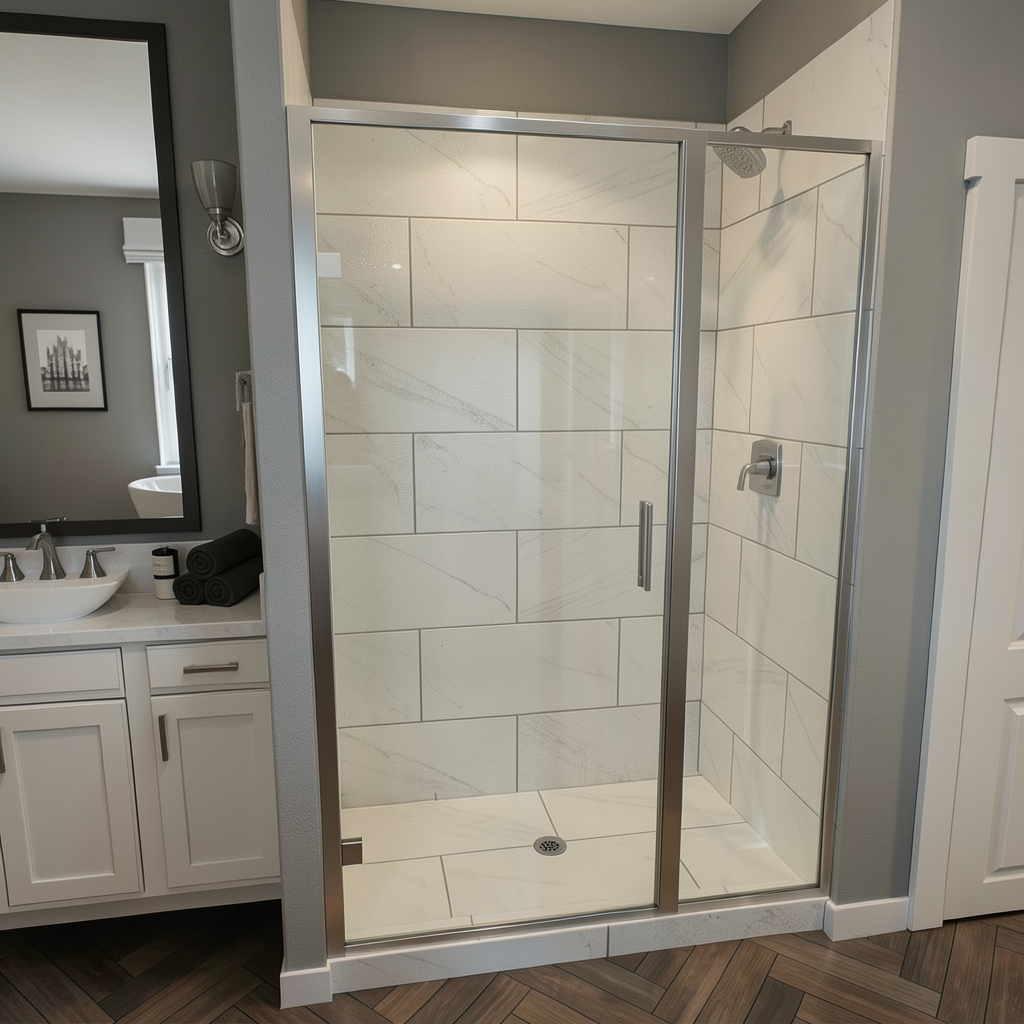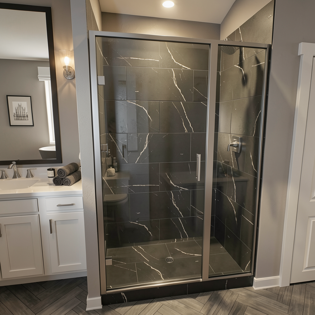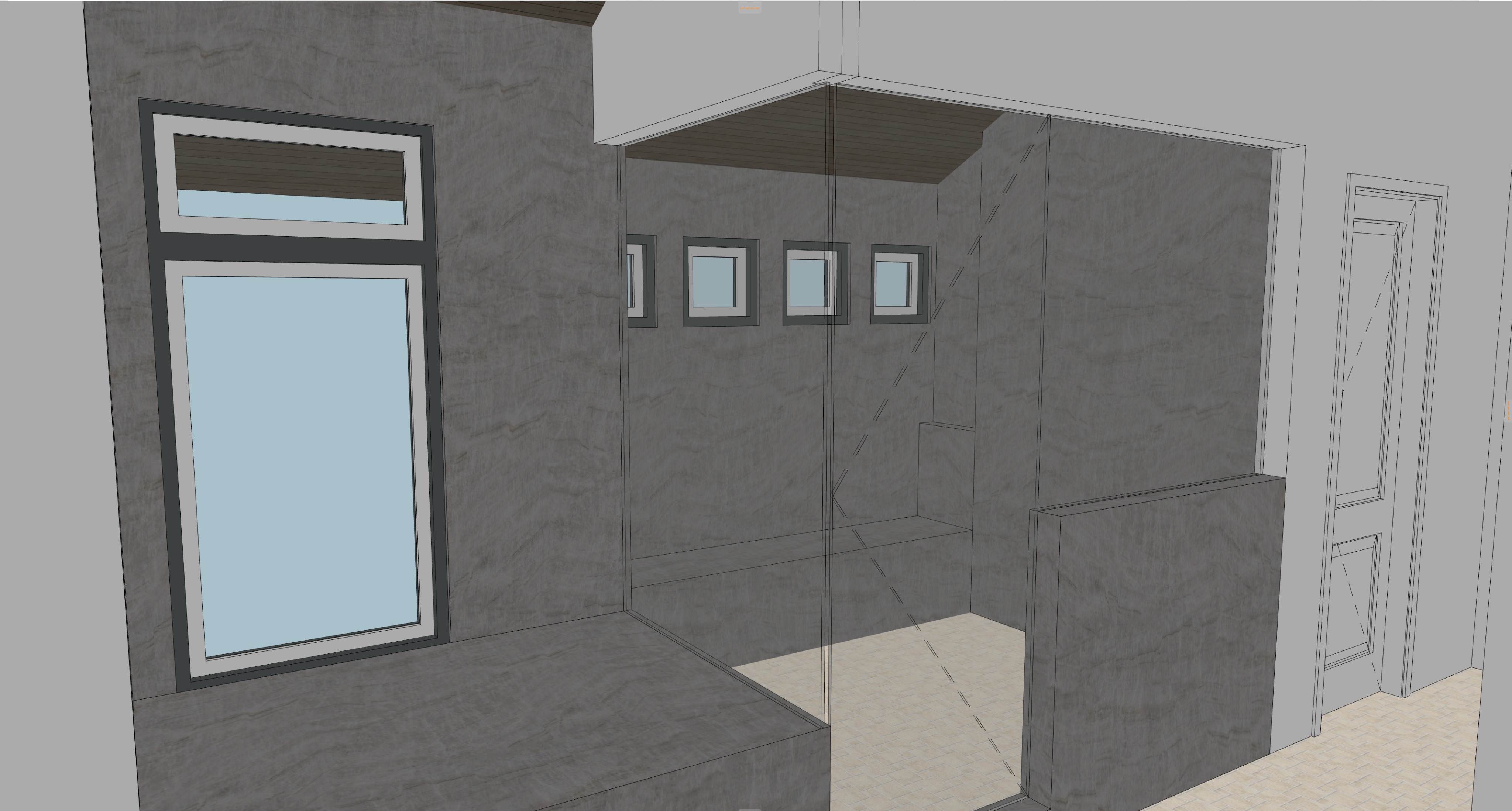 enhanced interior lighting white quartz slab on shower walls white quartz slab on tub deck brass shower controls and showerhead beyond glass on right wall of shower porcelain undermount tub built into the white quartz slab on left side brass deck mounted tub filler behind tub on left side small mosaic limestone tile on floor drain in center of shower floor natural wood door on right with wood trim and large wood header very light tan plaster on non slab walls black window cladding wood slate ceiling to match door wood