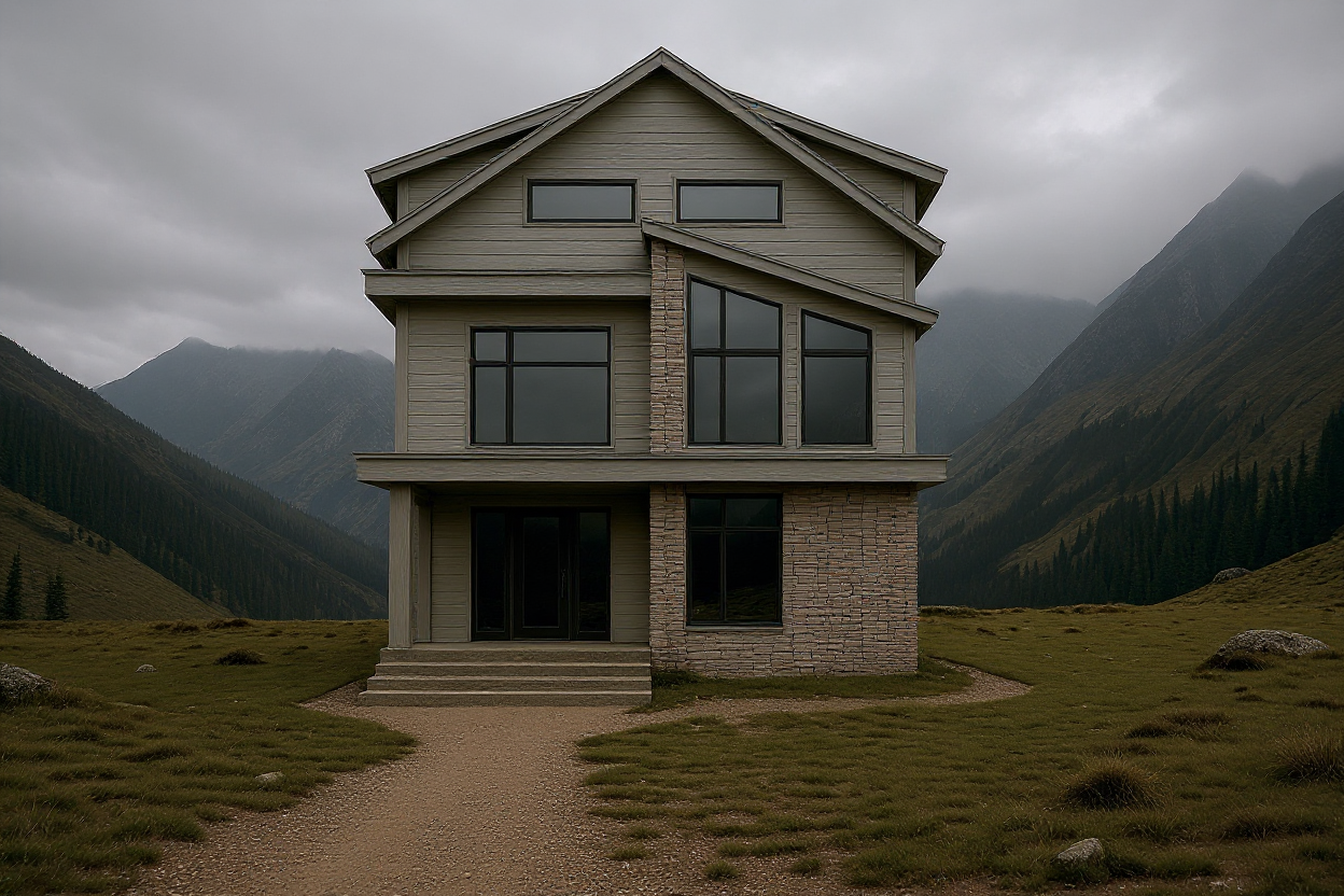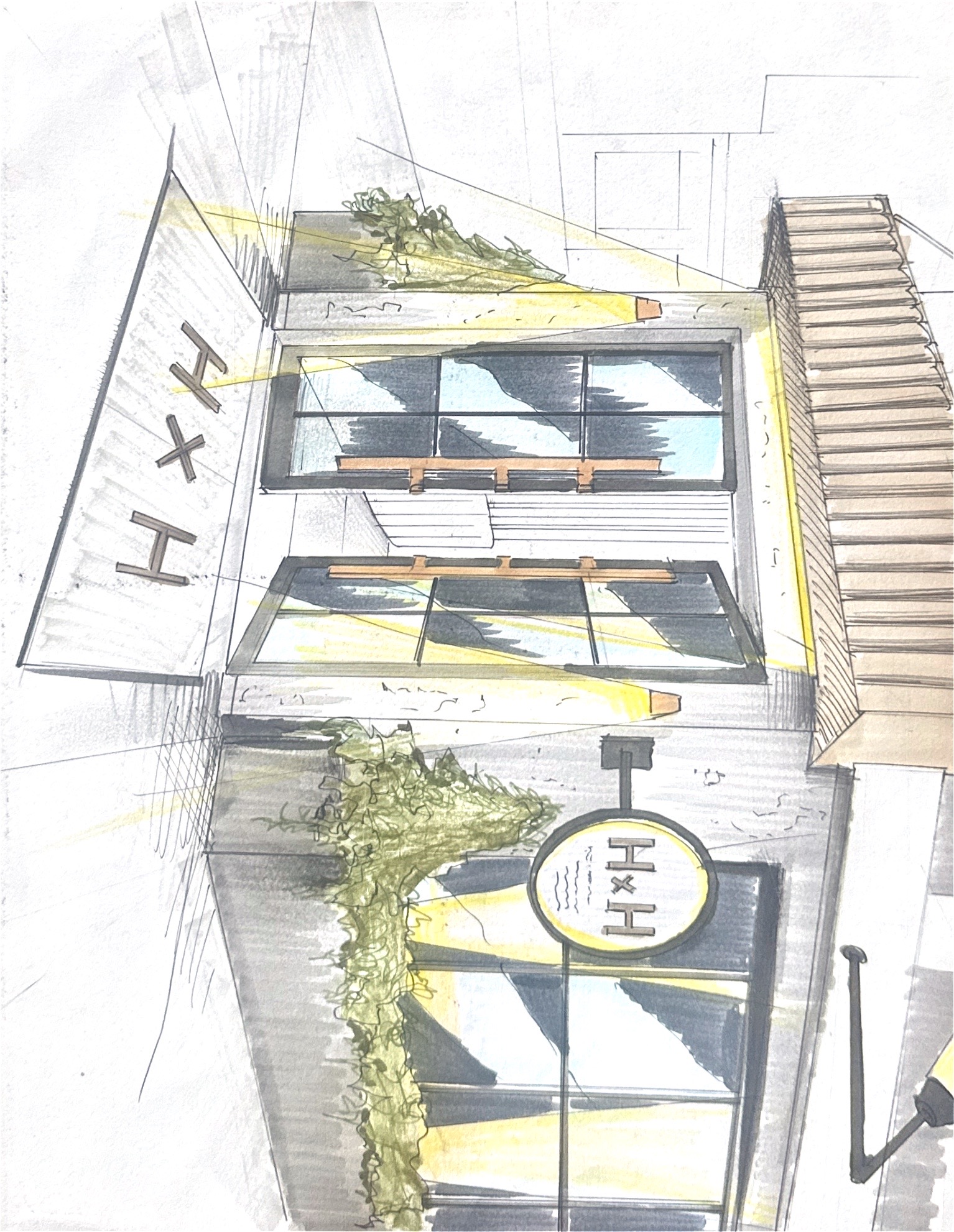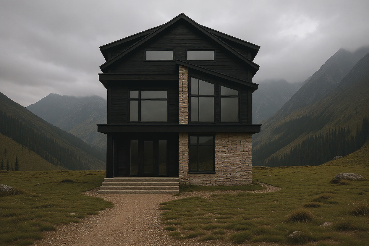 mediterranean revival exterior shot the exterior walls of this should be painted black brick it should show the exterior at dusk the soffit over the door is scalloped bronze metal the planters are black with overflowing green lush plantings no green on the doors paint the exterior black over the door goes bronze architecture