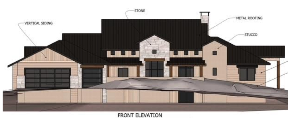 turn into a photorealistic picture with taupe siding and light taupe stucco and mountain landscape and modern exterior lighting