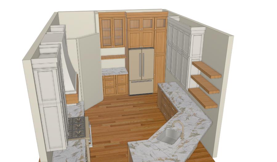 add a beautiful neutral square tile up the backsplashes and change the wood cabinets to a more neutral brown hickory and add some lighting