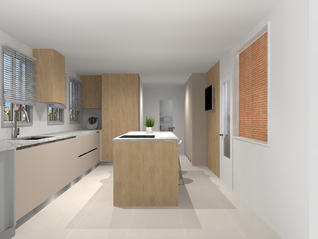 put a dining room through the right window do not change the colors of the cabinets