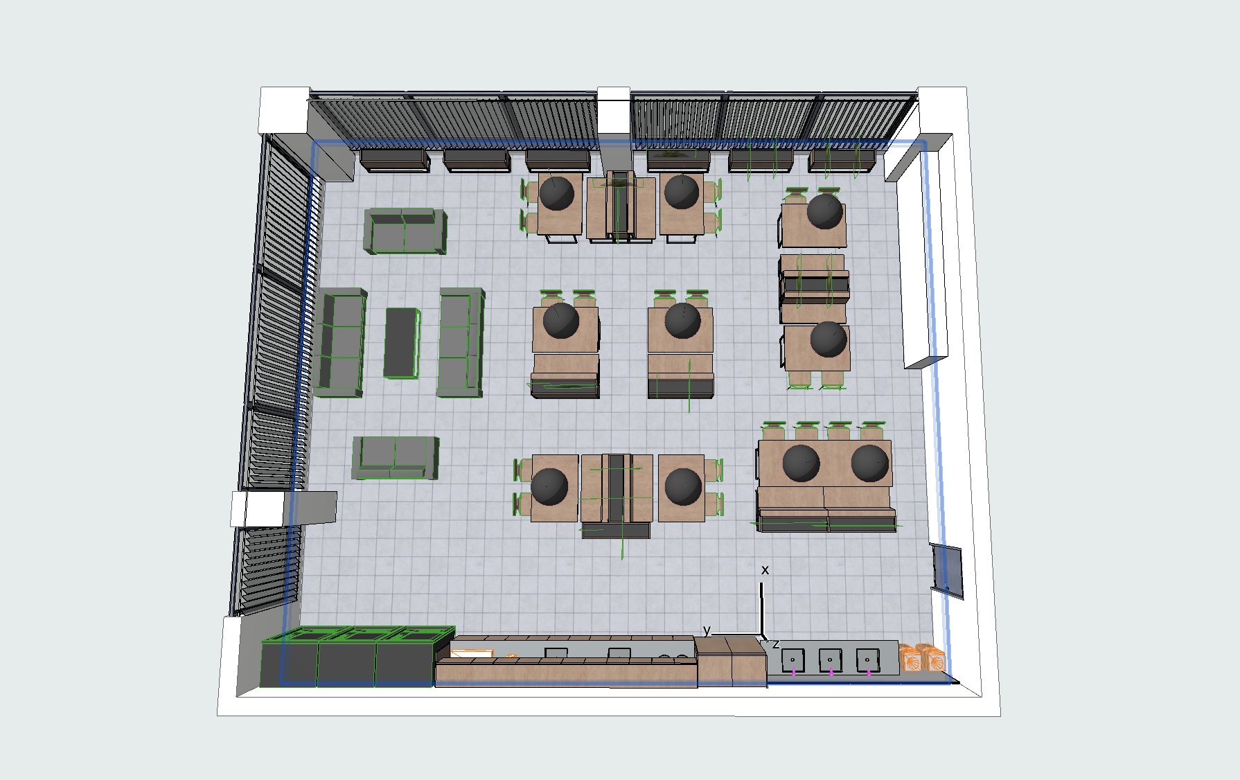 there are white vertical shutters in the windows no black vertical grid change the sofas to dark grey remove green purple and orange outlines
