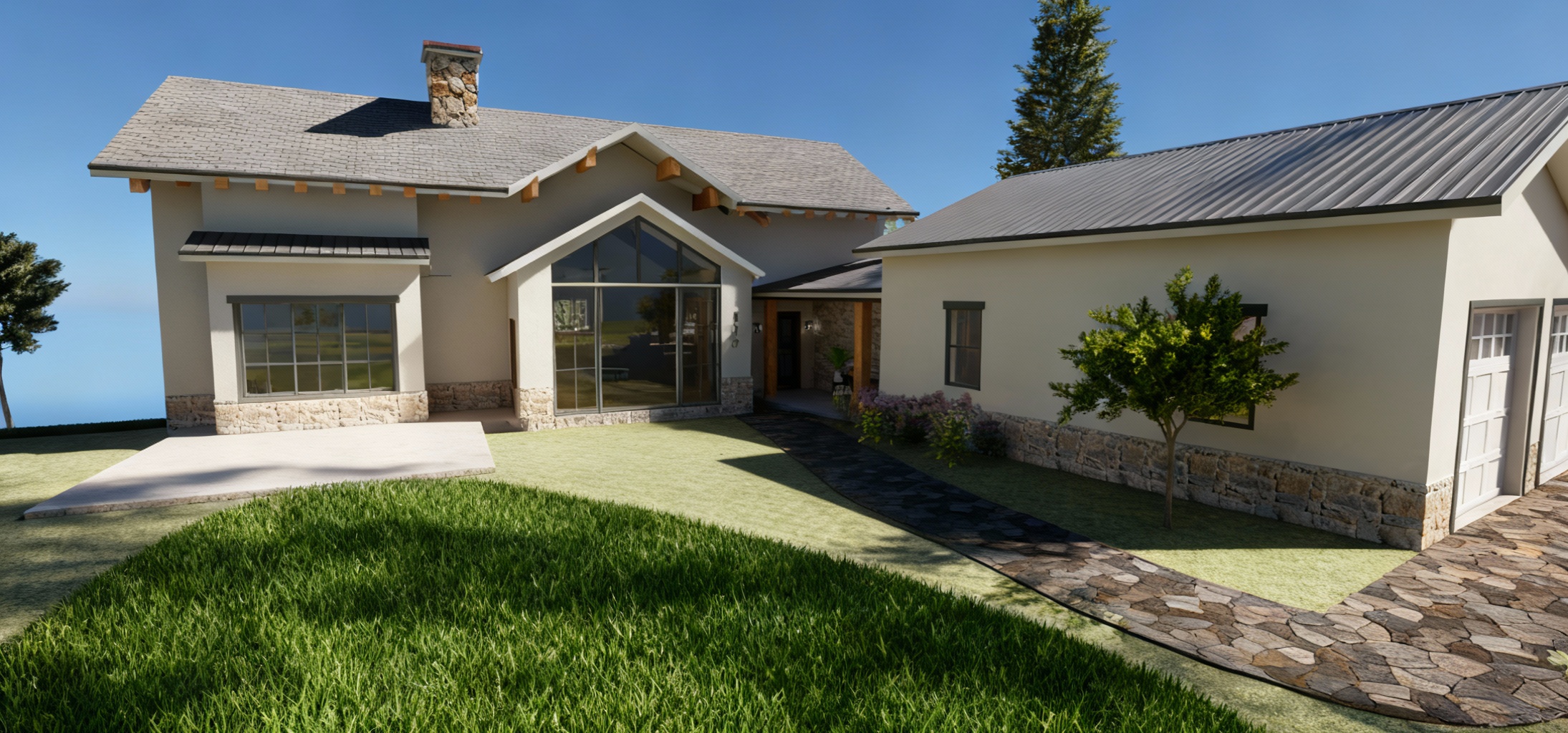 this is the right side elevation of the house and i need this exact view i need this to look realistic with horizontal dark grey siding black trim and black shingled roof on a grassy lot with trees in the background