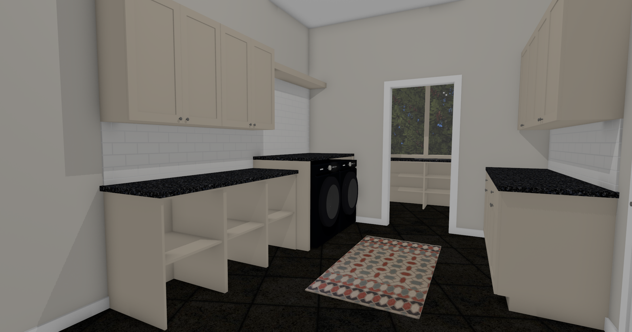 morning sunlight add minimalist decor on the countertops add laundry baskets on the lower shelves