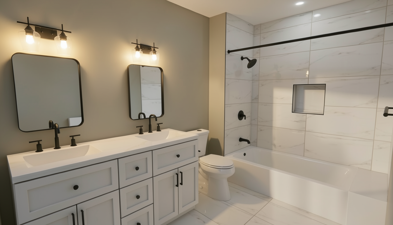 keep all the materials color and layout the same only change is make the wall color lighter and tiles matte make into photo realistic rendering
