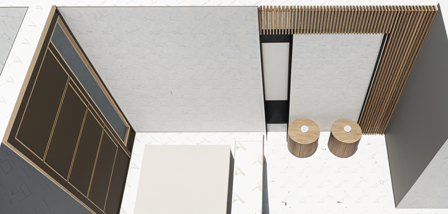 a white render and brown brick care home in front of a grey asphalt carpark setting featuring dark brown timber cladding on the front gable that has a overhang shading the entrance and fixed glazing with balcony above the shaded cover and immediately surrounding the gable and soft brown tiled roofs the sky is a clear light blue creating a tranquil morning atmosphere surround the building with a lush green bushes planted around the front main gable and parts of the building which extends of it dotted with small white flowers enhancing the peaceful ambiance capture the sunlight gently reflecting off the windows emphasizing warmth and inviting charm please keep the design in tact whilst generating render
