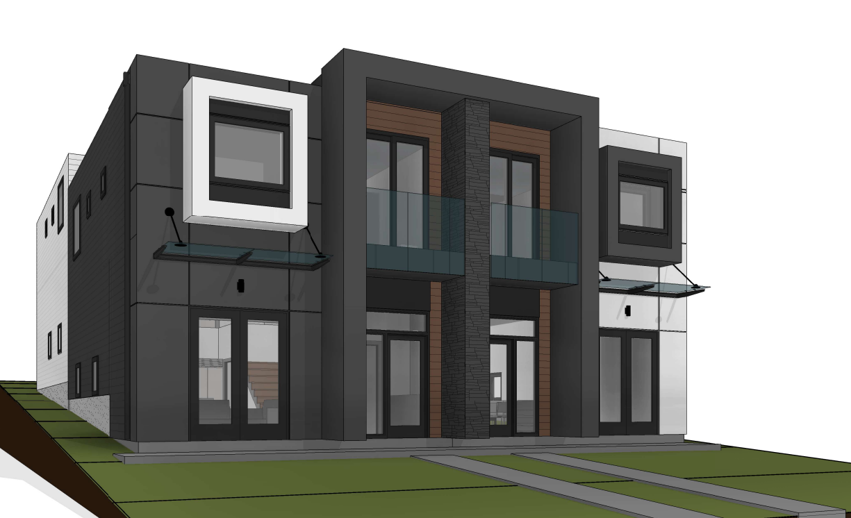 a modern two story duplex with a sleek contemporary design the left side main structure is a bold dark charcoal gray accented with pristine white rectangular frames around the windows the right side is mainly white with charcoal grey accents the central facade features a textured stone column with a rich warm wooden paneling adding contrast the windows are framed with black and a transparent blue tinted glass balcony adds elegance to the design the overall atmosphere is sophisticated and minimalist set against a lush green lawn with clean concrete pathways soft ambient lighting casts gentle shadows enhancing the building s modern geometry lush seattle neighbourhood contemporary landscape with tall pampas grasses cedar hedges and boxwood hedges