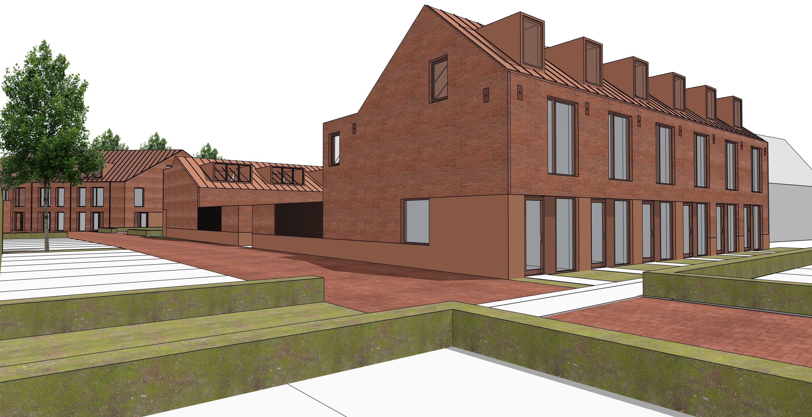 create a warm and inviting residential courtyard scene inspired by contemporary dutch architecture the main buildings should feature facades made of red brown mottled brick and window frames in an orange red brown tone the roof detailing must consist of vertical panels in a red brown color with a matte weathered texture adjacent buildings may appear more abstract while still maintaining a sense of neighborhood cohesion use the exact perspective of the provided reference image and do not alter the composition in any way between the sidewalk and the bottom edge of the window frames include a trasraam plinth made of pigmented concrete in the same color as the window frames place some softly draped open white curtains behind the glass to add residential warmth and interior depth depict an autumn like day in the netherlands with soft slightly diffused daylight and gentle warm tones with the sun positioned later in the afternoon on the right side of the scene include a tree with autumn foliage in front of the buildings on the left side of the street in front of the last building add an additional tree behind the main building add five big trees to create a natural backdrop include a parking area with a few cars and surround each parking space with a hedge approximately 50 cm high in front of the building add small garden areas with grass and flowering plants to enhance the residential character include a pedestrian sidewalk and use traditional dutch style brick pavers for the street surface add subtle landscaping and a few people walking or cycling to create a calm community oriented atmosphere llow some subtle visibility of modern interior elements inside the building with bedrooms located on the upper floors and a living room on the ground floor