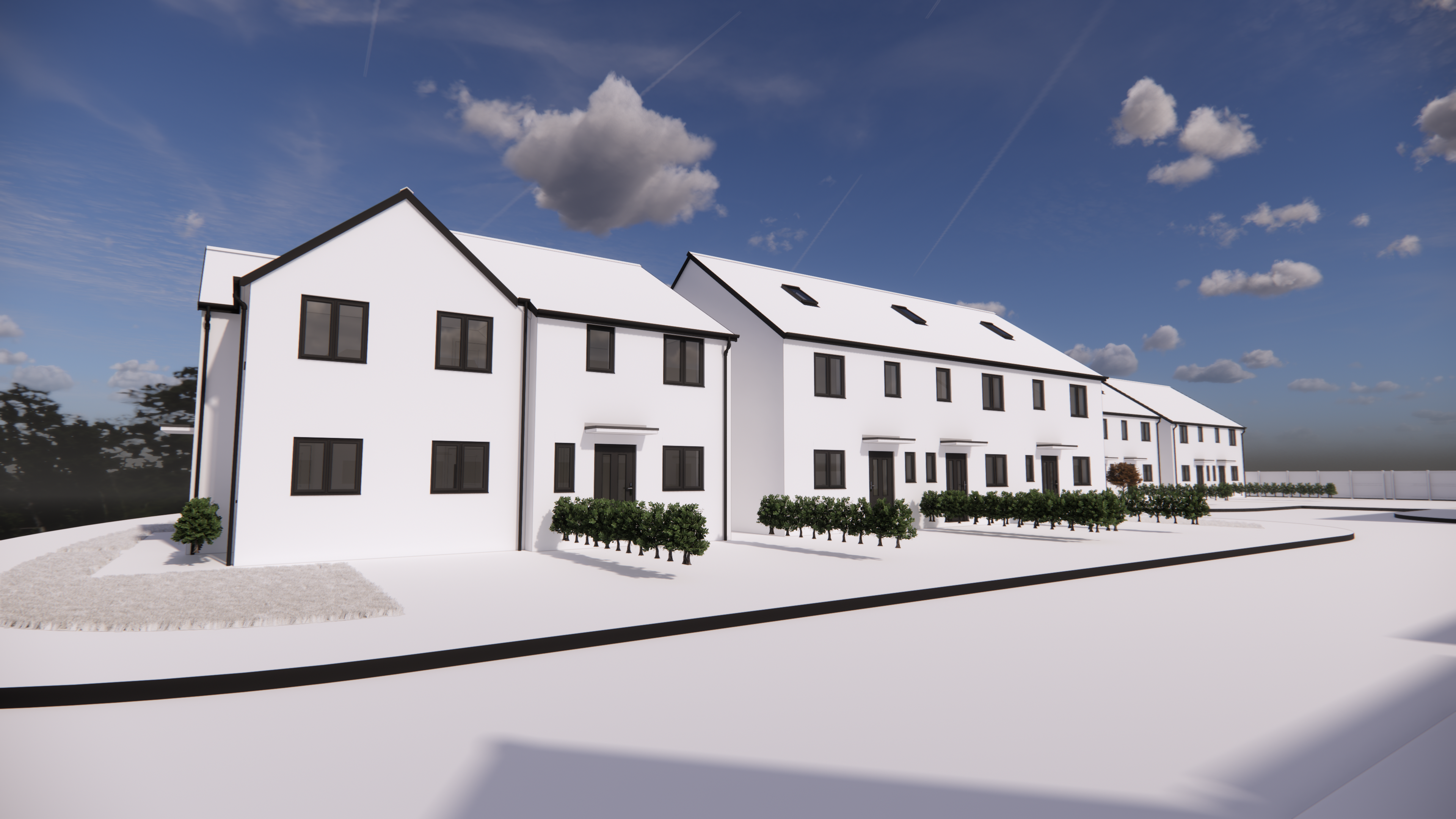 photorealistic cgi of modern uk terraced houses change white render walls into a red multi brick with headers over ground floor windows pitched grey slate roofs anthracite grey windows and doors entrance canopies maintain the original massing and geometry add realistic grass lawns neat paving trimmed hedges and small suburban planting bright natural daylight clear blue sky high detail professional cg