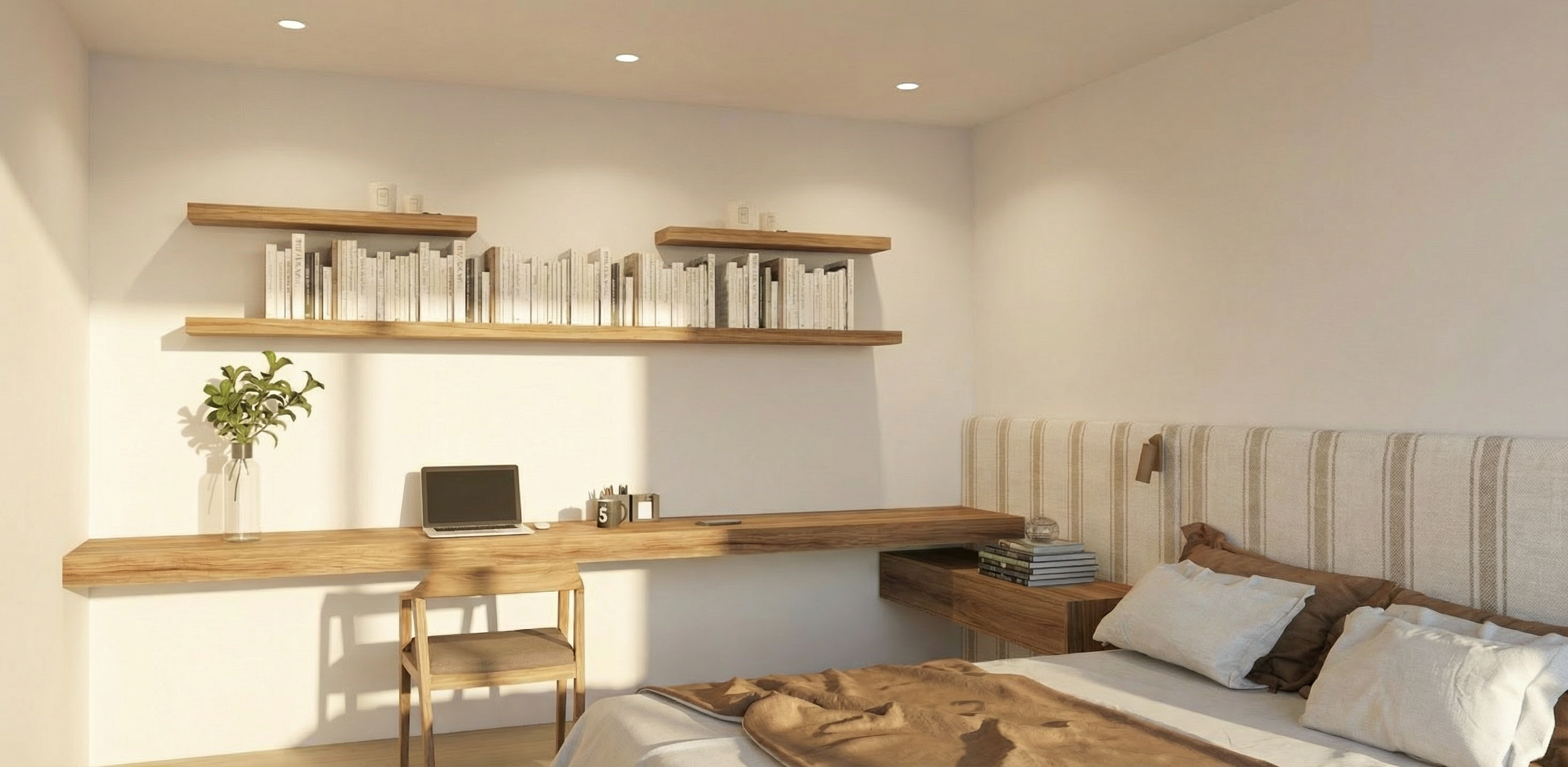 a modern minimalist interior design light gray large flooring complements a light wood grained cabined natural oak and a cabinet with matte black handles with elegant brass fittings completes the design the atmosphere is calm and relaxing complemented by the presence of a minimalist and modern living room furniture body with a suspended large tv use warmer tones of colors perfect for a family space not too cold