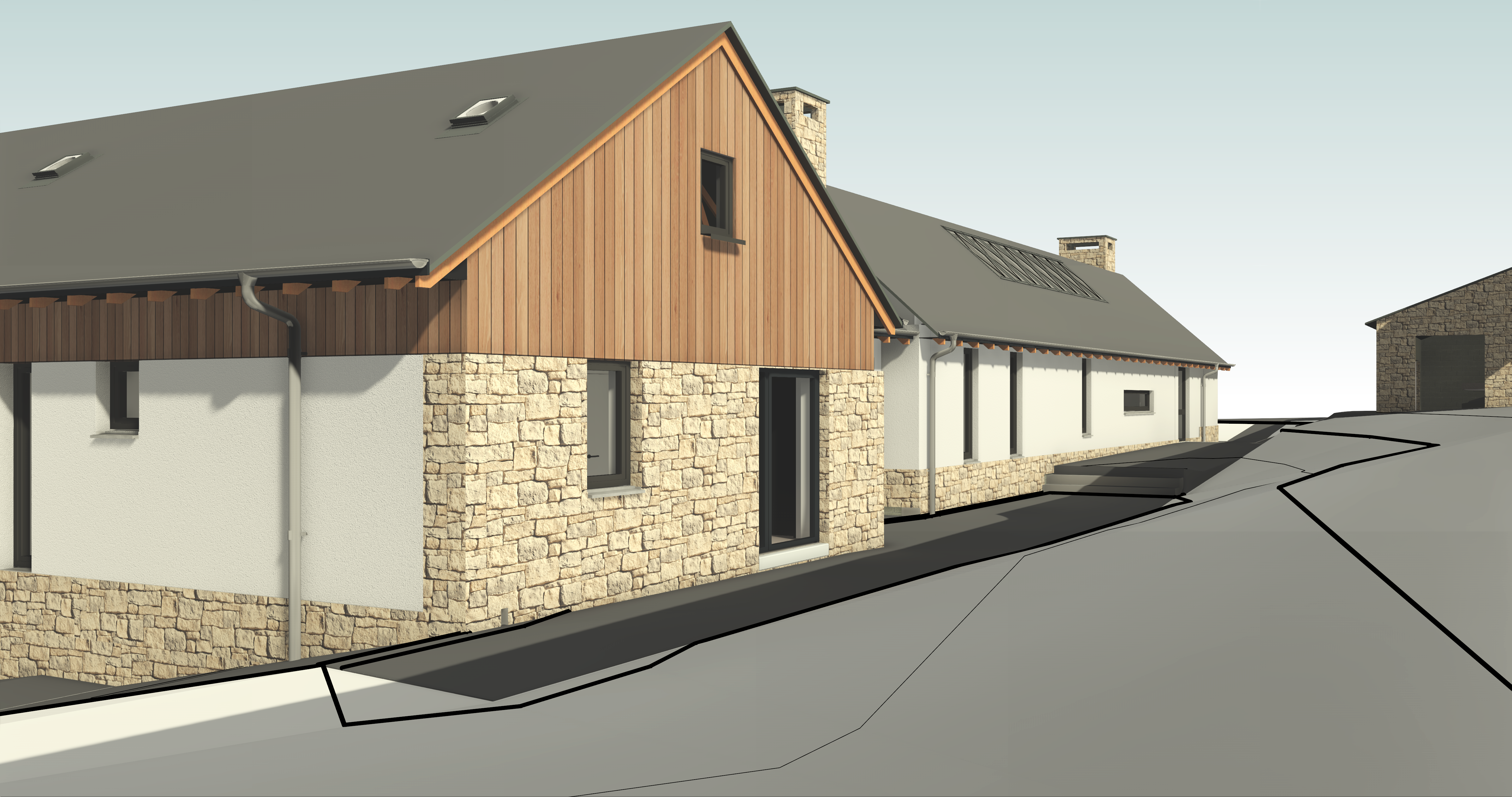 add weather as sunny with few clouds trees and grass to white ground make grey paving make cream brick a buff cream stone only show grass where white