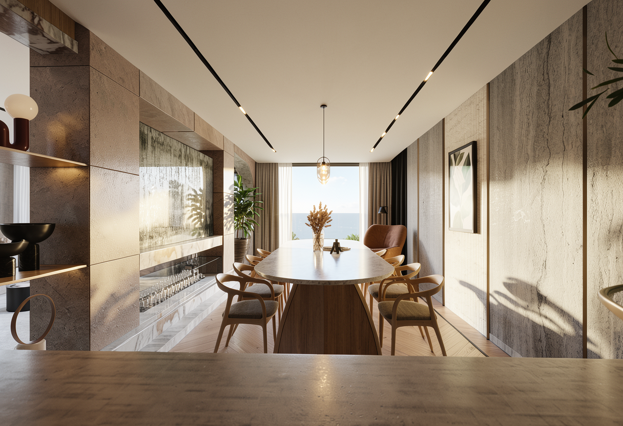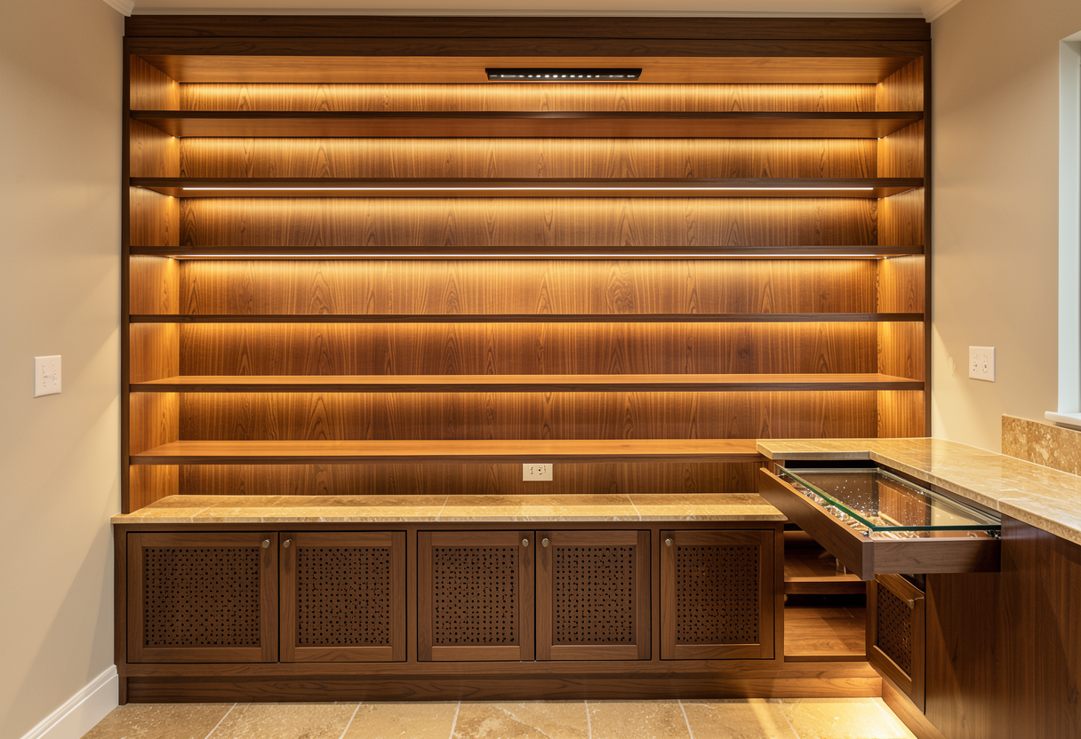 custom humidor with spanish cedar with led stipe lighting for every shelf with tan stone flooring floor to ceiling shelves add bottom cabinets with tiny star holes front panels a glass back countertop that shines through to a pull out cabinet