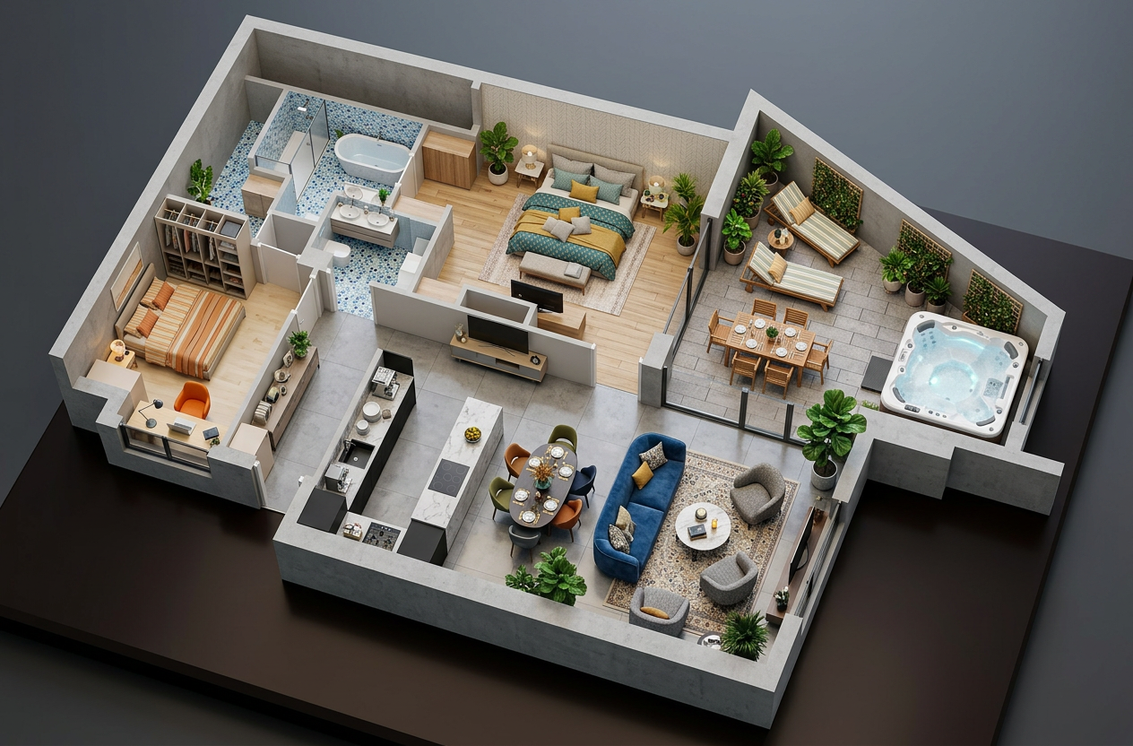 please create realistic rendering with realistic materials realistic landscaping with additional landscaping around the home such as small garden beds around the permiter of the home keep driveway as shown keep house as main focus lighting is to bright and direct