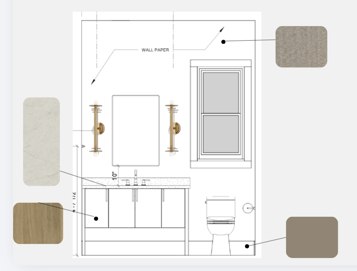 render this powder room elevation with slab counter wood cabinets hardwood floor pendants flanking mirror wallpaper on walls and painted darker baseboard