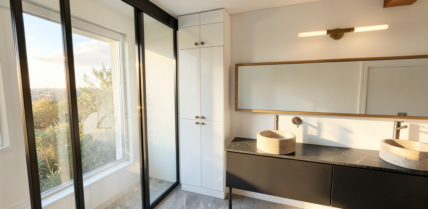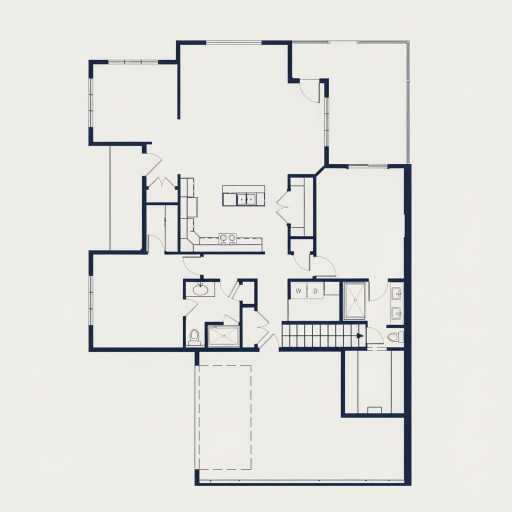 enhance and vectorize this architectural floor plan increase line clarity and sharpen all interior details fixtures cabinetry plumbing symbols maintain exact layout scale wall thickness and placement convert to crisp high resolution suitable for print change all the lines to a dark navy blue