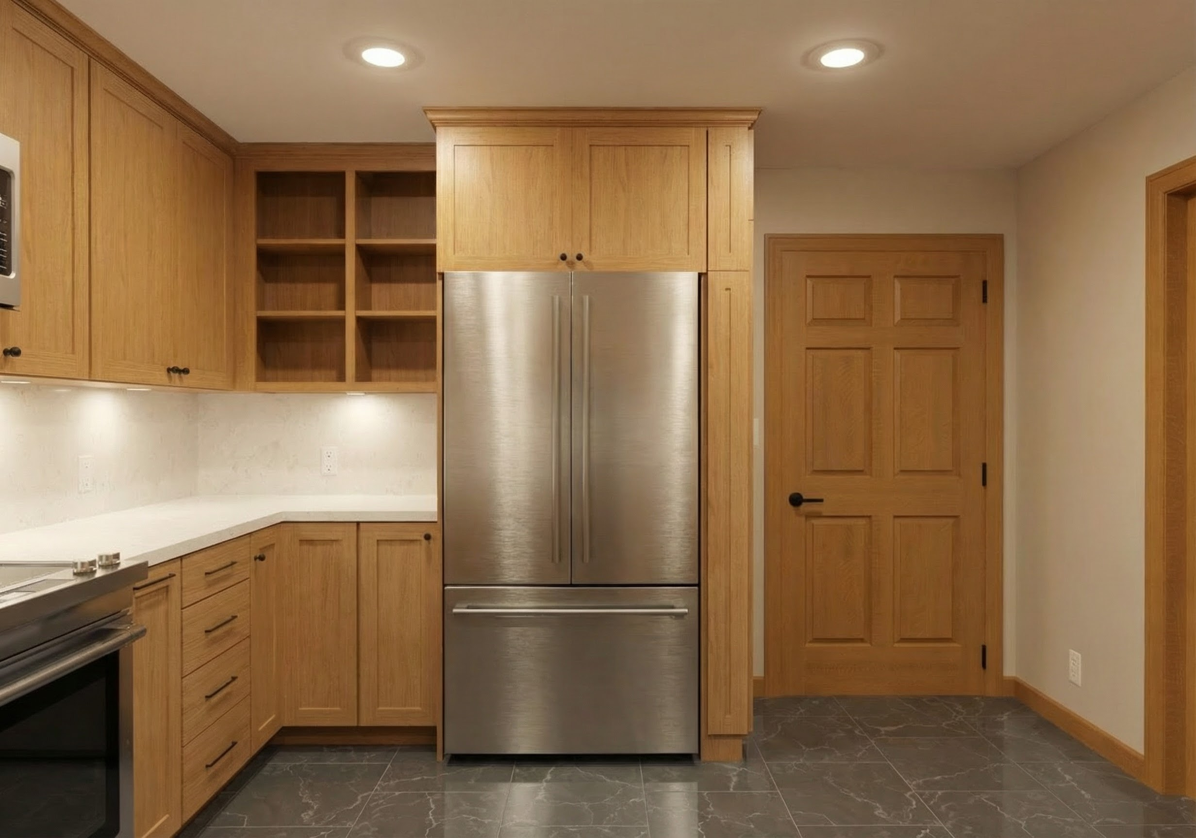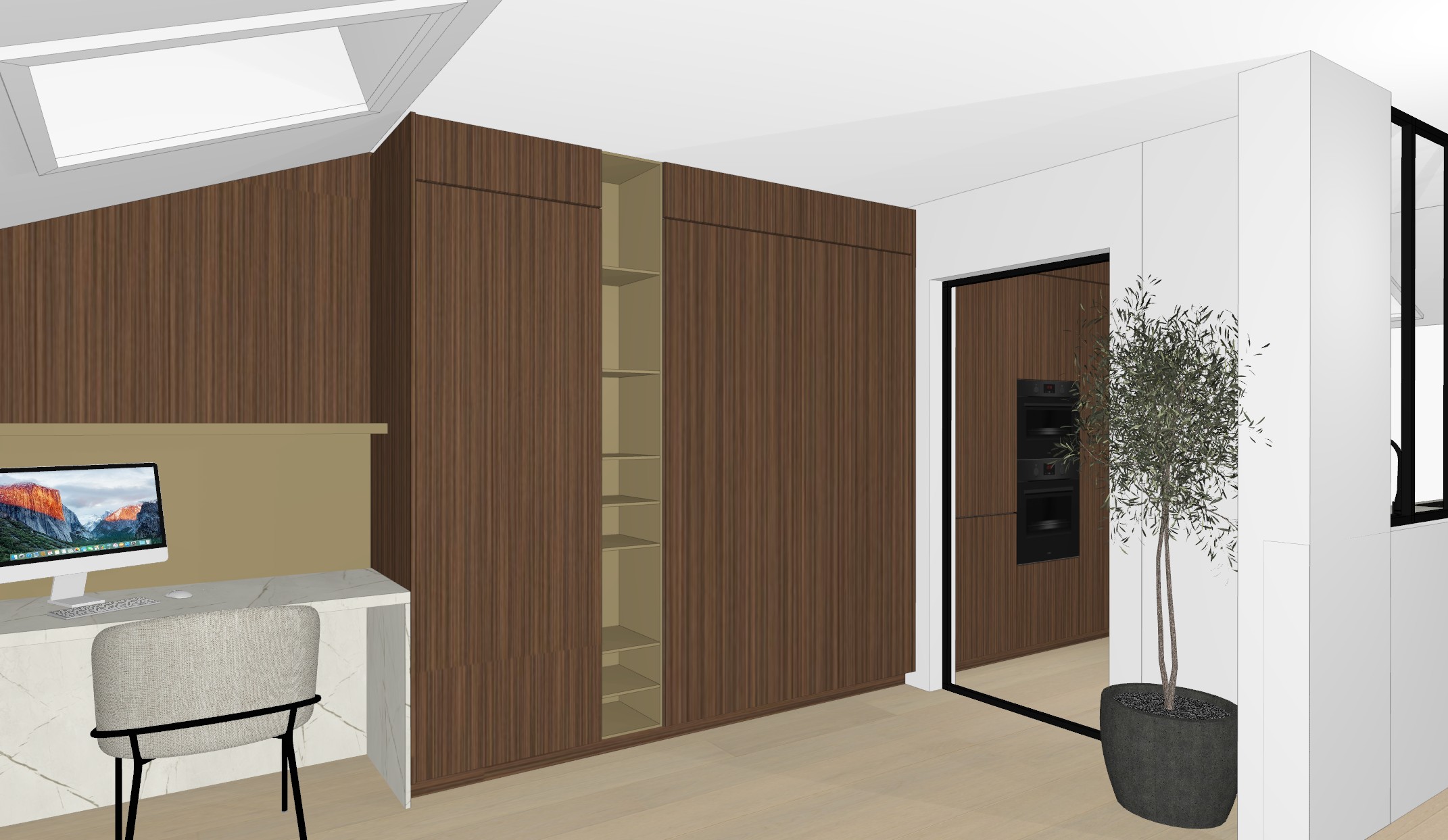a vertically nerved brown oak door with gold steel accents and a warm white marble worktop with subtle gold veigns on a light oak planked parquet