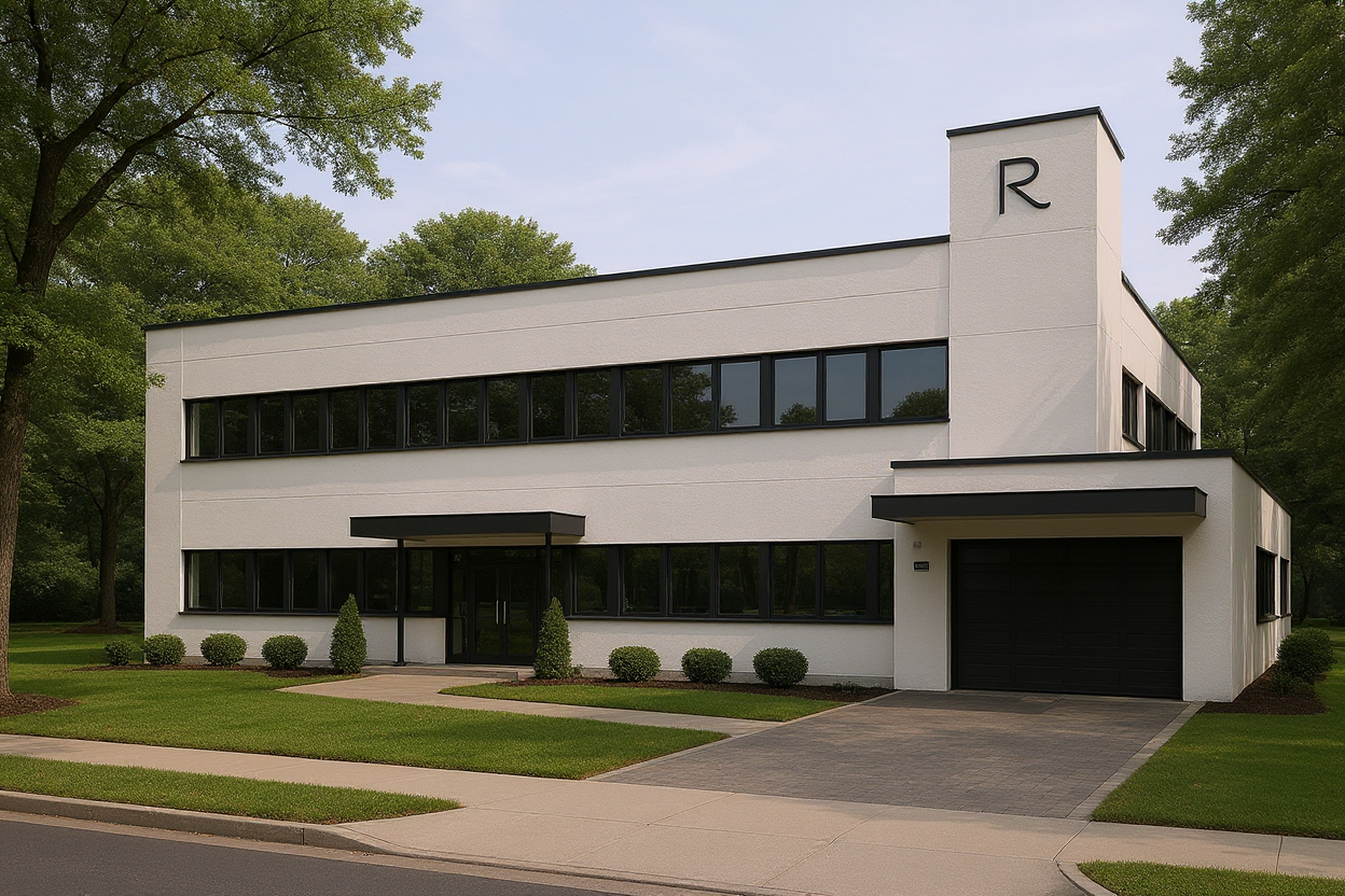 modern exterior shot modern office building dark reflective glass dark frames white main body black r logo at tower covered drop off area on the right please do not add any additional trimwork other than small frieze trim along top of the building which should be black architecture