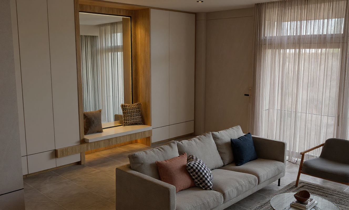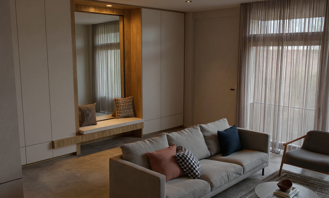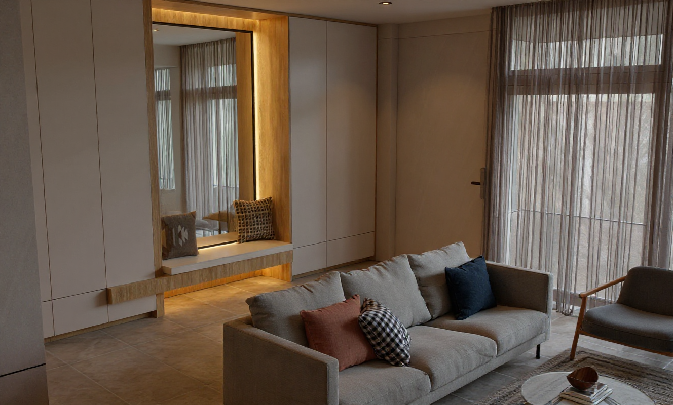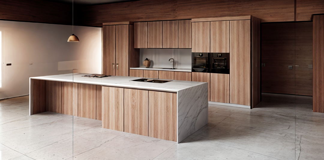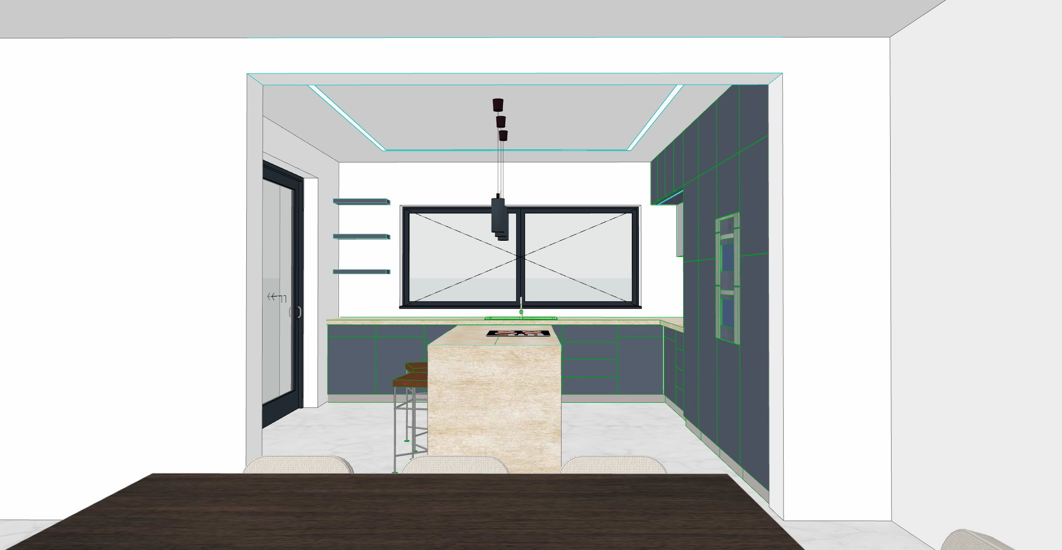 create a modern minimalist kitchen interior the walls and ceiling are bright white with a smooth matte finish creating a clean and open atmosphere use a dark charcoal gray for the cabinets lending a sharp contemporary contrast the kitchen island features a light beige marble texture adding a touch of elegance the countertops are a subtle greenish hue providing a natural accent pendant lights in matte black hang above the island offering a chic industrial vibe the large window frames are black enhancing the modern aesthetic while the floor is a polished light gray marble with a glossy finish the overall ambiance is sleek and sophisticated with a cozy and welcoming feel