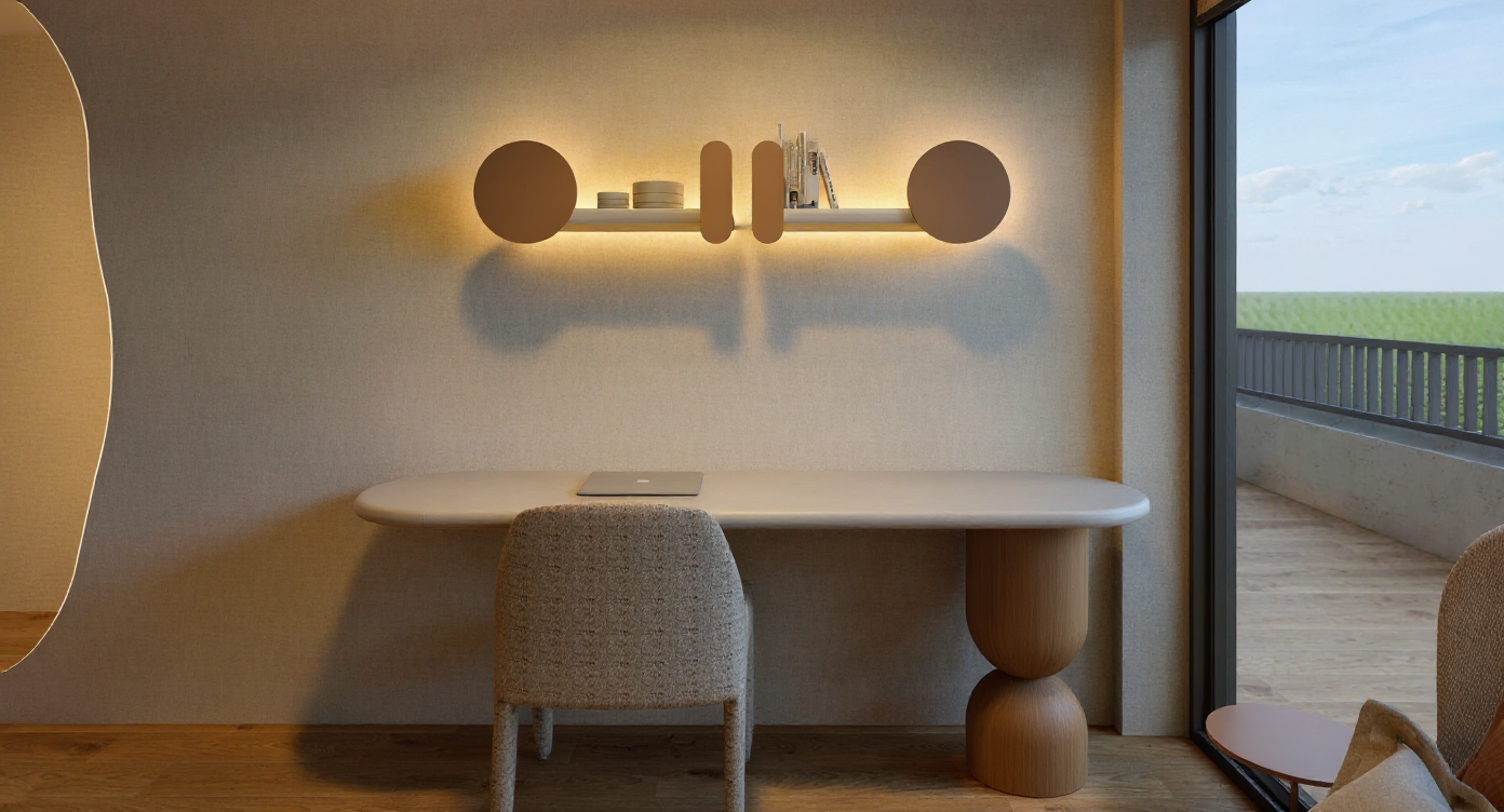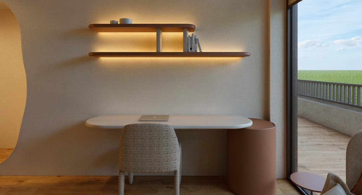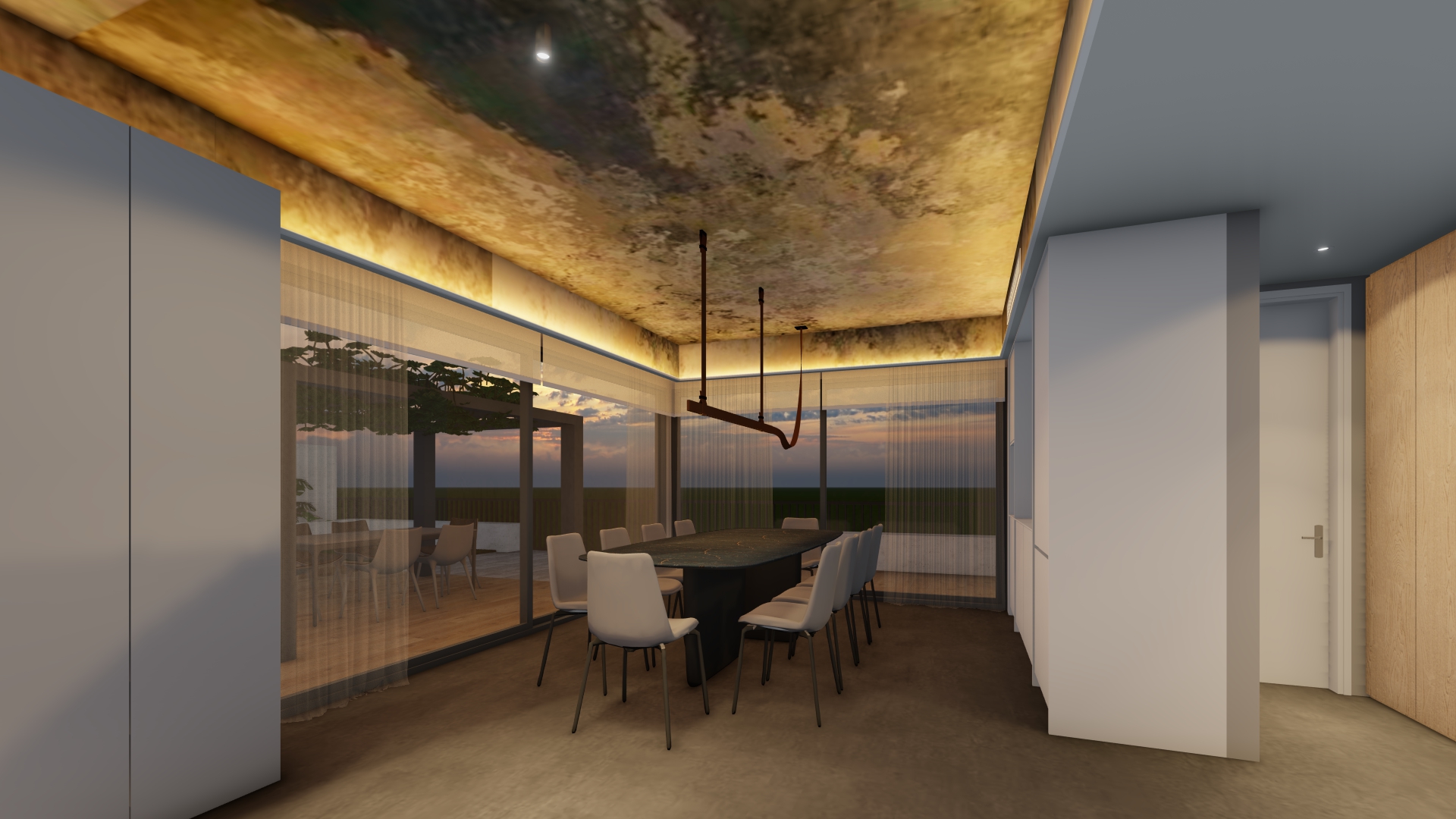 render this image in a realistic style maintaining the exact same composition furnishings lightning and design without adding or removing elements the floor is made of gray ceramic like polished concrete
