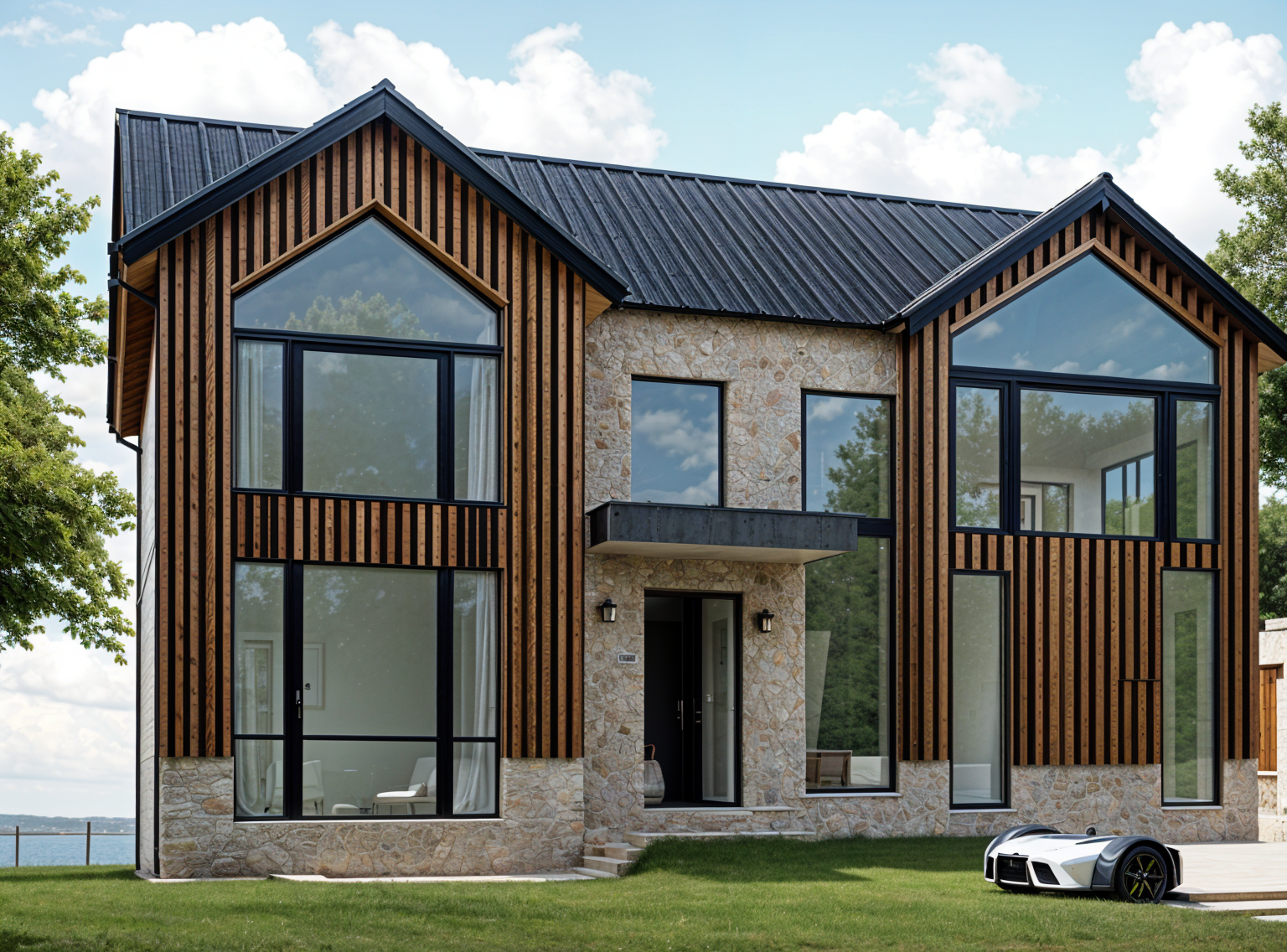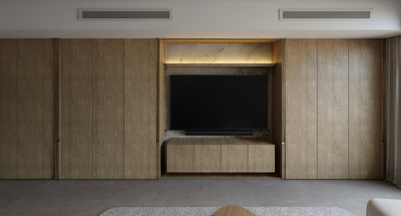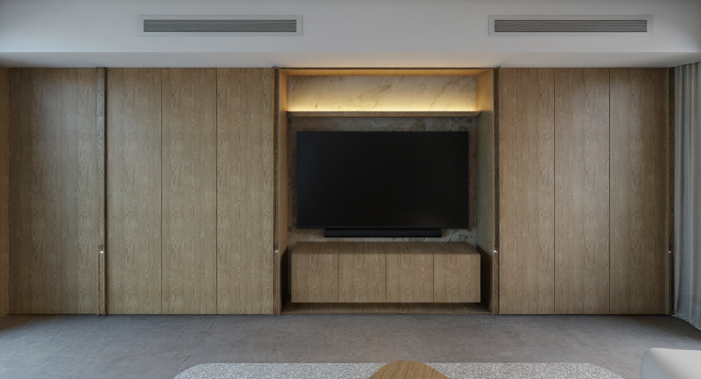 render this image in a realistic style maintaining the exact same composition furnishings lightning and design without adding or removing elements the floor is made of gray ceramic like polished concrete